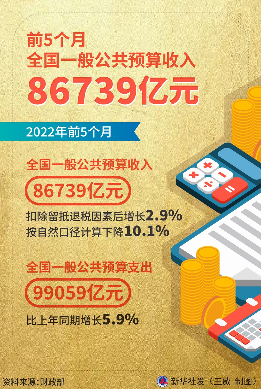 財(cái)政部6月16日發(fā)布數(shù)據(jù)顯示,今年前5個(gè)月,全國(guó)一般公共預(yù)算收入86739億元,扣除留抵退稅因素后增長(zhǎng)2.9%,按自然口徑計(jì)算下降10.1%。