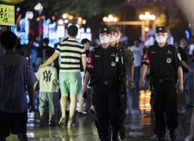 圖為7月18日晚,民警聯(lián)合武警在步行街進行巡邏。