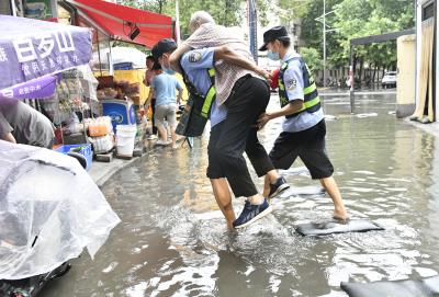 7月22日,河南省鄭州市突降暴雨,市區(qū)部分低洼區(qū)域形成積水,給群眾生活造成不便。鄭州市公安局民警輔警走上街頭服務群眾。
