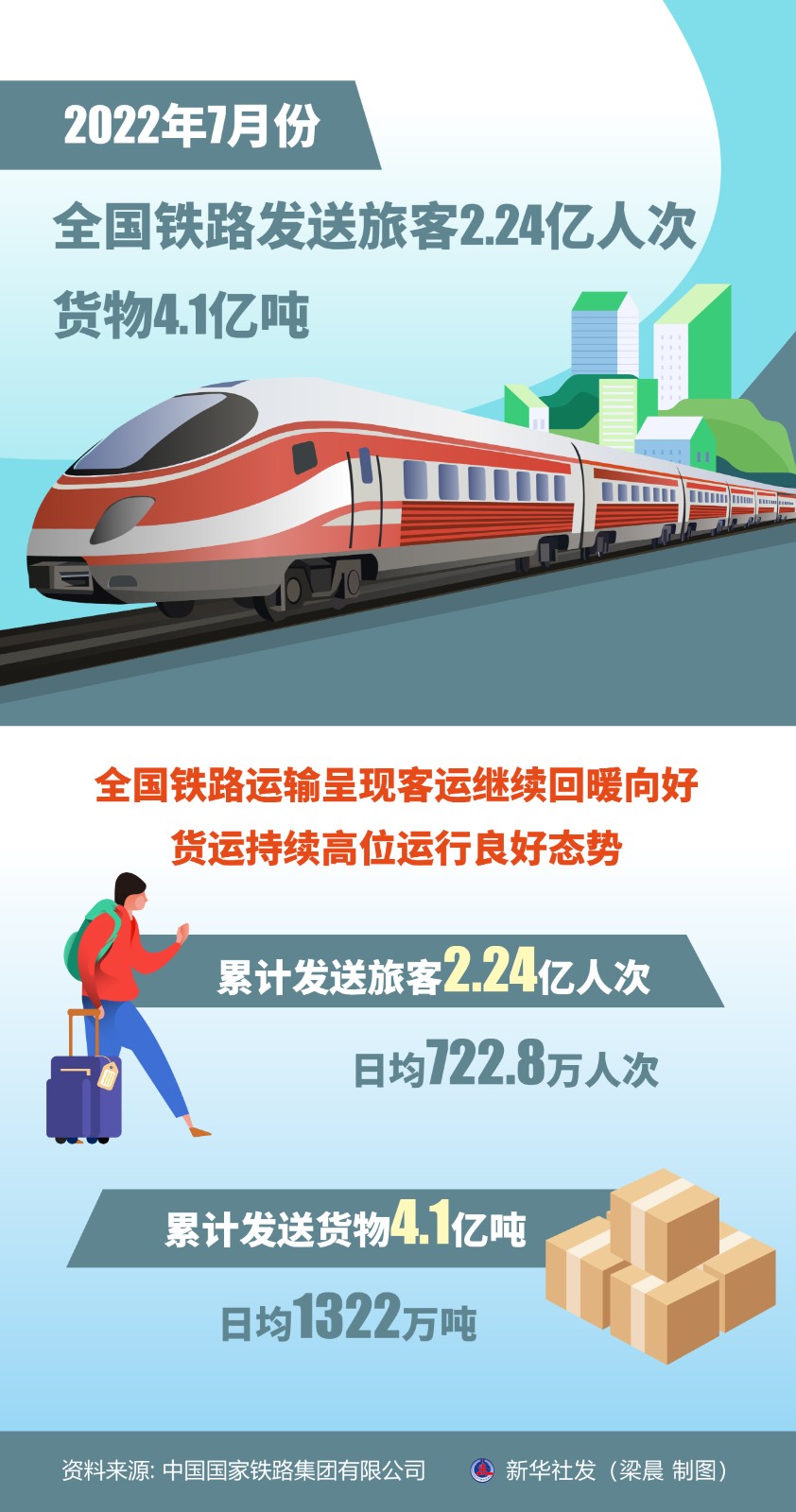 記者8月1日從中國國家鐵路集團(tuán)有限公司獲悉,7月份,全國鐵路運輸呈現(xiàn)客運繼續(xù)回暖向好、貨運持續(xù)高位運行良好態(tài)勢,累計發(fā)送旅客2.24億人次,日均722.8萬人次;累計發(fā)送貨物4.1億噸,日均1322萬噸。
