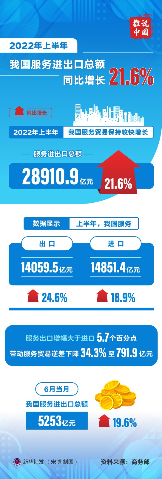 記者8月4日從商務(wù)部獲悉,上半年,我國服務(wù)貿(mào)易保持較快增長。服務(wù)進出口總額28910.9億元,同比增長21.6%。