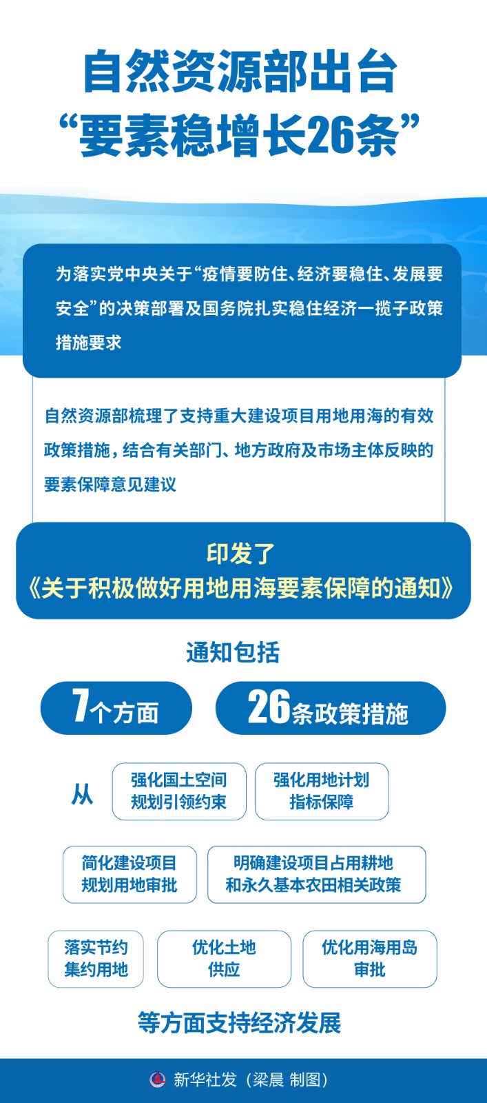 新華社記者8月8日在自然資源部新聞通氣會上獲悉,為落實黨中央關于“疫情要防住、經濟要穩(wěn)住、發(fā)展要安全”的決策部署及國務院扎實穩(wěn)住經濟一攬子政策措施要求,自然資源部梳理了支持重大建設項目用地用海的有效政策措施,結合有關部門、地方政府及市場主體反映的要素保障意見建議,印發(fā)了《關于積極做好用地用海要素保障的通知》,通知包括7個方面26條政策措施,從強化國土空間規(guī)劃引領約束、強化用地計劃指標保障、簡化建設項目規(guī)劃用地審批、明確建設項目占用耕地和永久基本農田相關政策、落實節(jié)約集約用地、優(yōu)化土地供應、優(yōu)化用海用島審批等方面支持經濟發(fā)展。