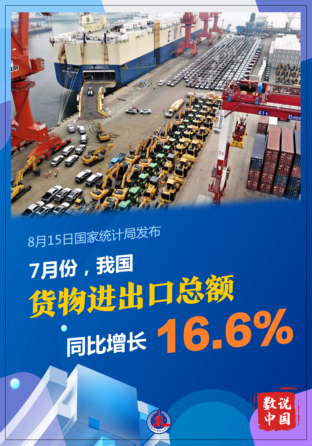 國家統(tǒng)計局8月15日發(fā)布數據顯示,7月份,貨物進出口總額同比增長16.6%,比上月加快2.3個百分點。