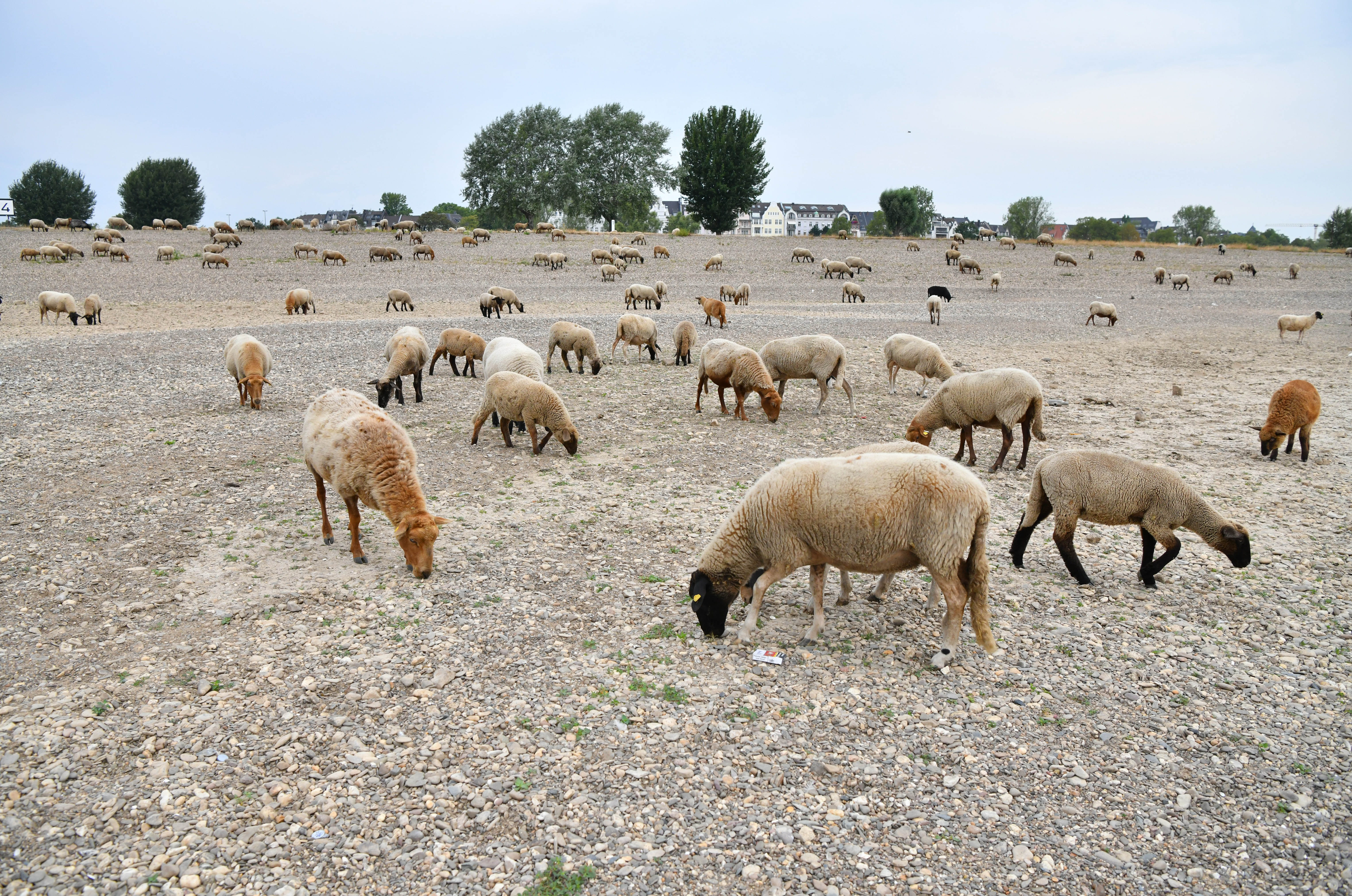 8月17日,在德國北威州杜塞爾多夫,羊群在萊茵河岸覓食。