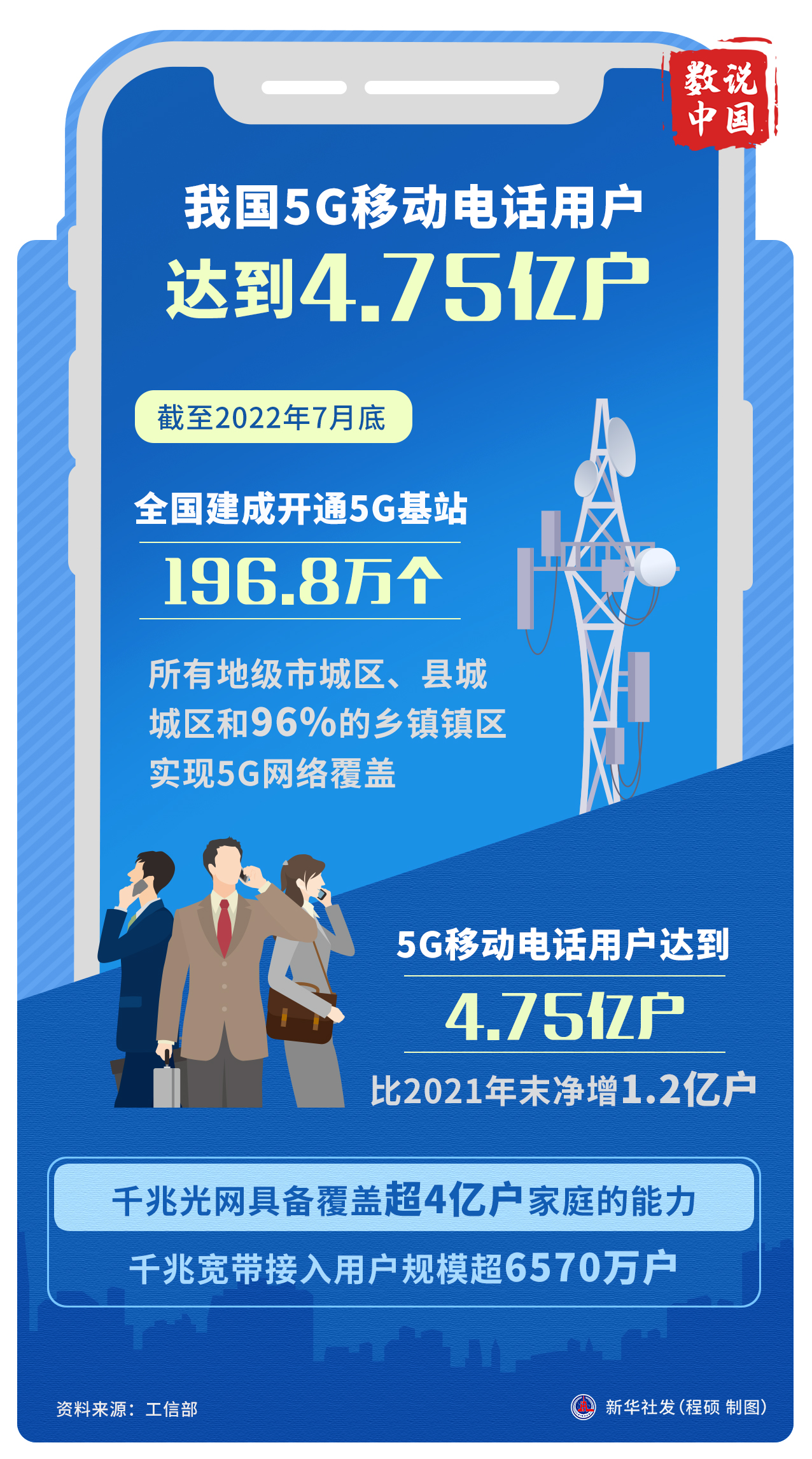 工信部信息通信發(fā)展司司長謝存8月19日表示,截至7月底,全國建成開通5G基站196.8萬個(gè),所有地級(jí)市城區(qū)、縣城城區(qū)和96%的鄉(xiāng)鎮(zhèn)鎮(zhèn)區(qū)實(shí)現(xiàn)5G網(wǎng)絡(luò)覆蓋,5G移動(dòng)電話用戶達(dá)到4.75億戶,比2021年末凈增1.2億戶,千兆光網(wǎng)具備覆蓋超4億戶家庭的能力,千兆寬帶接入用戶規(guī)模超6570萬戶。