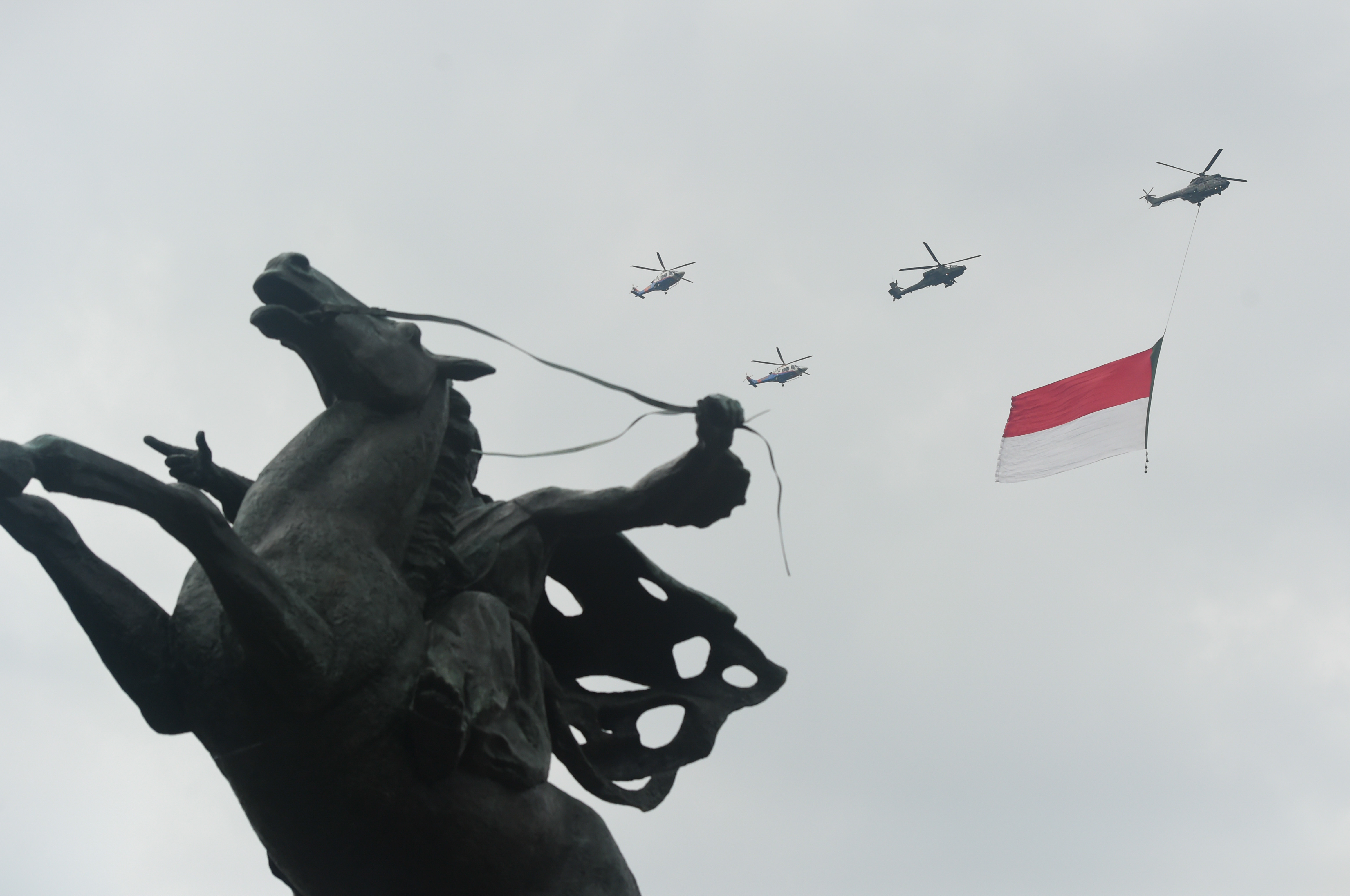 8月17日,懸掛印度尼西亞國旗的飛機編隊飛過首都雅加達上空。