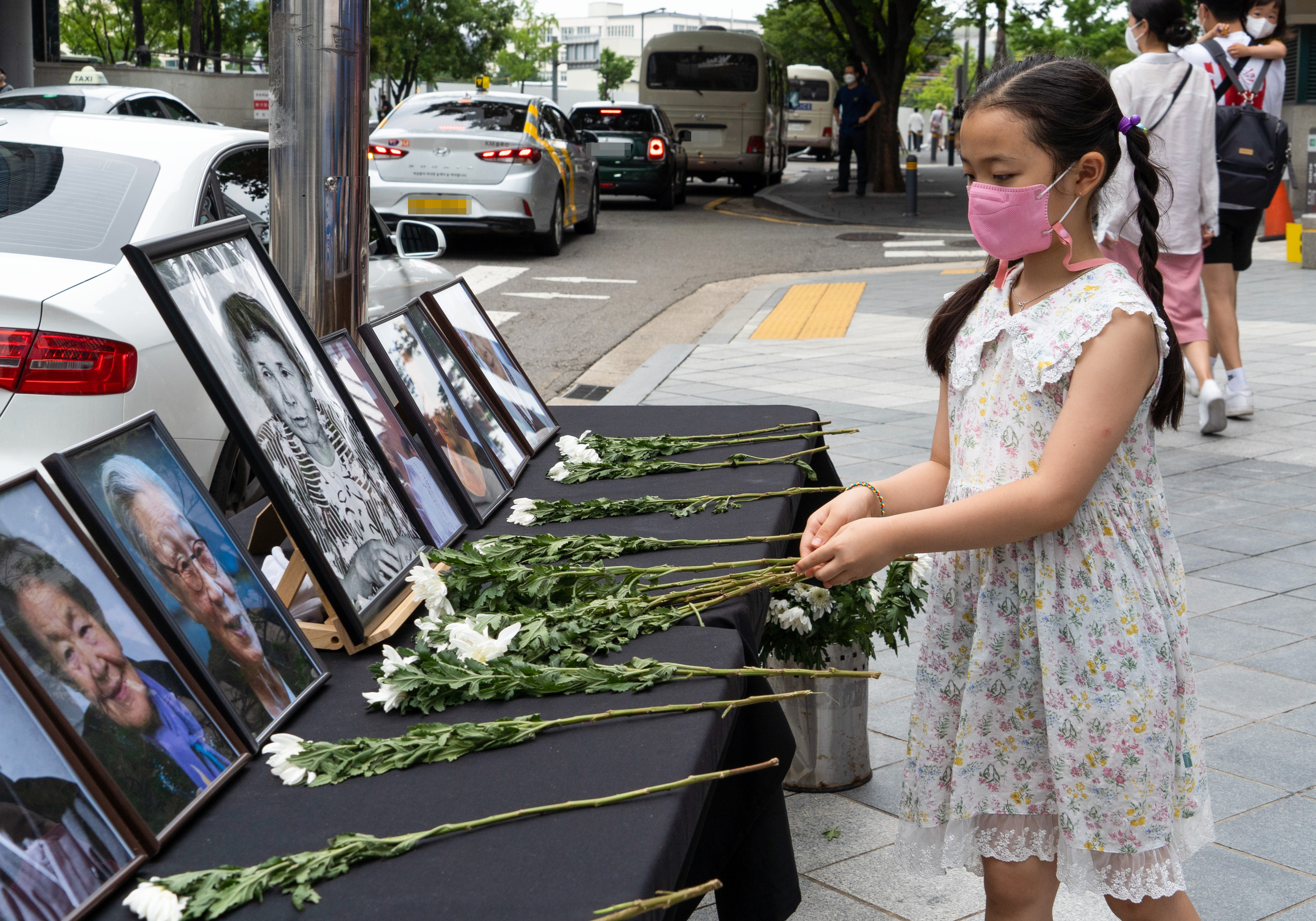 8月14日,在韓國(guó)首爾舉行的日軍“慰安婦”受害者紀(jì)念日活動(dòng)上,一名兒童在“慰安婦”受害者的照片前獻(xiàn)花。