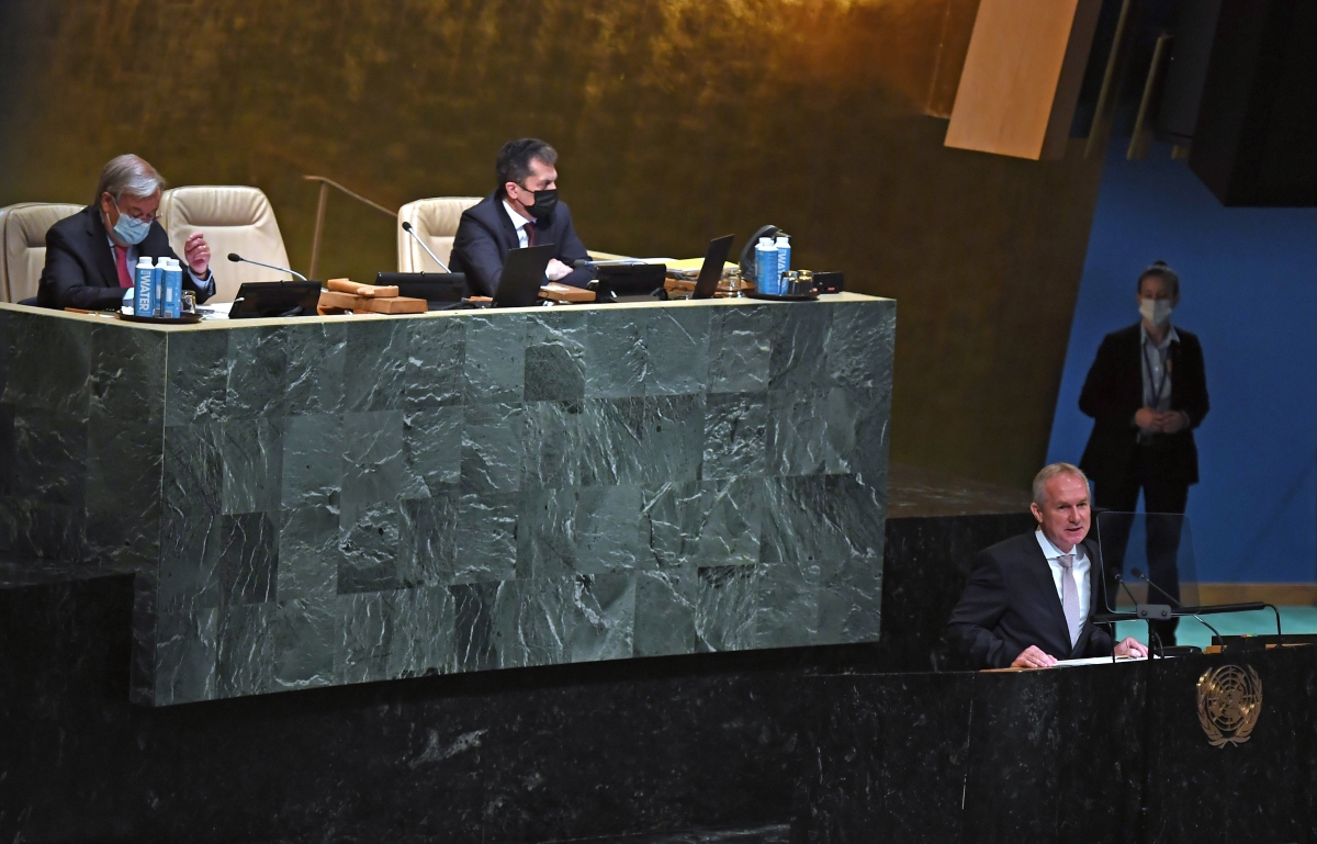 9月20日,在位于紐約的聯(lián)合國總部,第77屆聯(lián)合國大會主席克勒希(前)在第77屆聯(lián)合國大會一般性辯論開幕式上致辭。