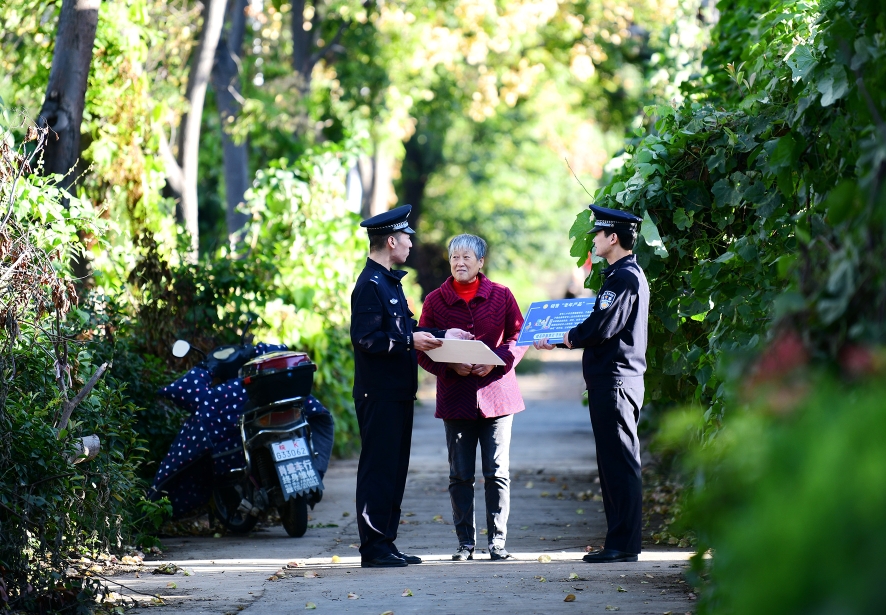 10月9日,安徽省阜南縣公安局城西派出所民警在轄區(qū)一居民家門口宣講防范網(wǎng)絡電信詐騙和養(yǎng)老詐騙常識。