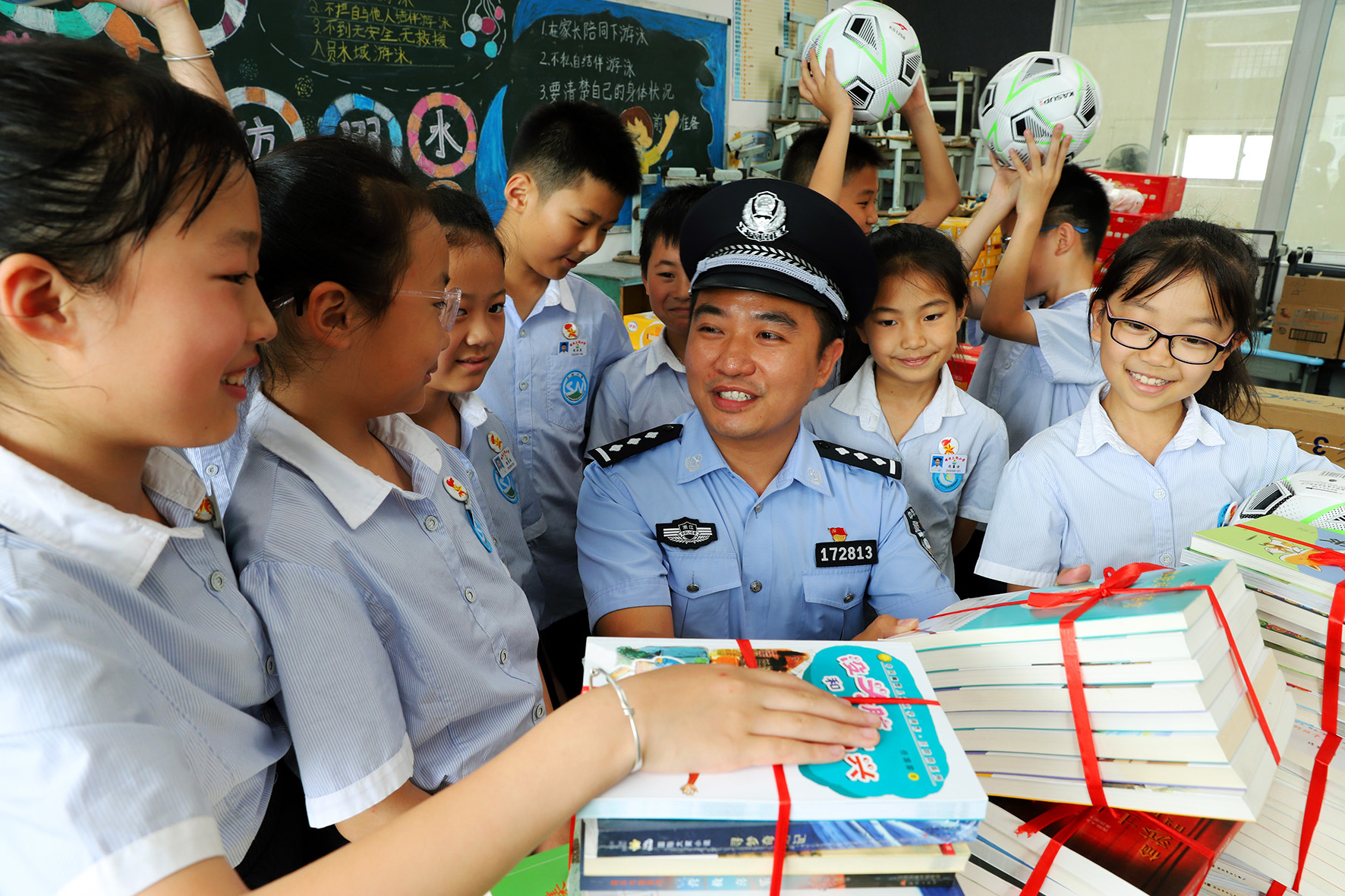 5月30日,浙江省臺州市路橋區(qū)螺洋派出所民警為上倪小學(xué)的同學(xué)們送去課外讀物、體育用品等節(jié)日禮物,并向同學(xué)們宣講夏季防溺水、防雷電知識。