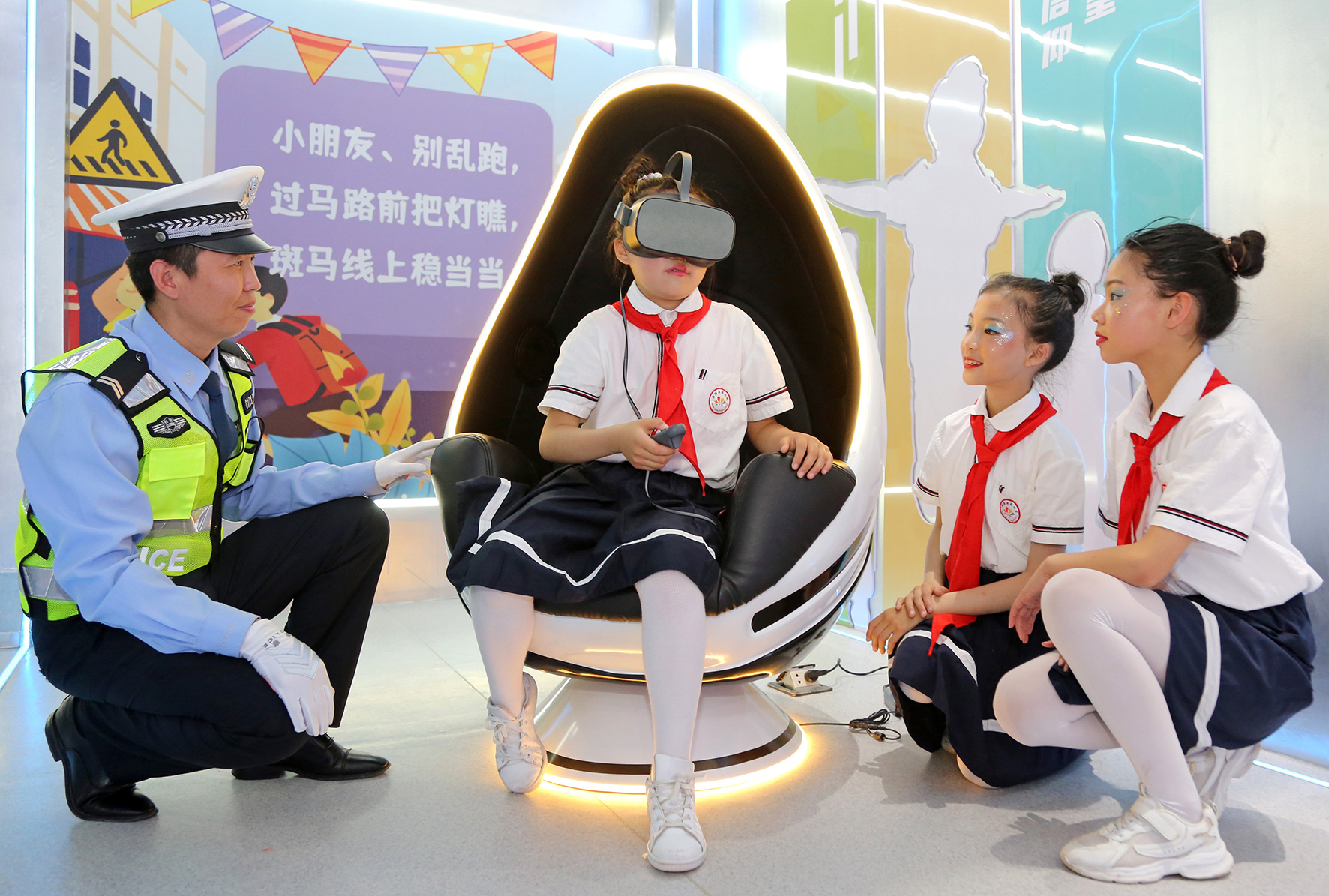 5月30日,陜西省渭南市高新區(qū)紅旗駕校交通安全教育基地兒童VR交通安全模擬體驗(yàn)區(qū),小學(xué)生在沉浸式體驗(yàn)道路交通安全。當(dāng)日,渭南市公安局交警支隊(duì)高新大隊(duì)開展“知危險 會避險”交通安全主題宣傳活動。