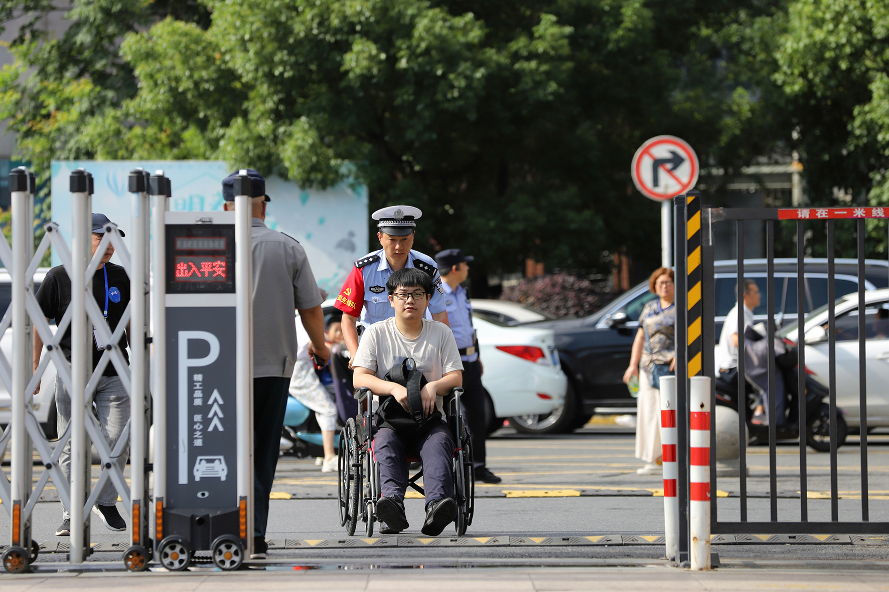 6月8日,甘肅省古浪縣公安局“愛心護考”執(zhí)勤點民輔警護送行動不便的考生進入考場。