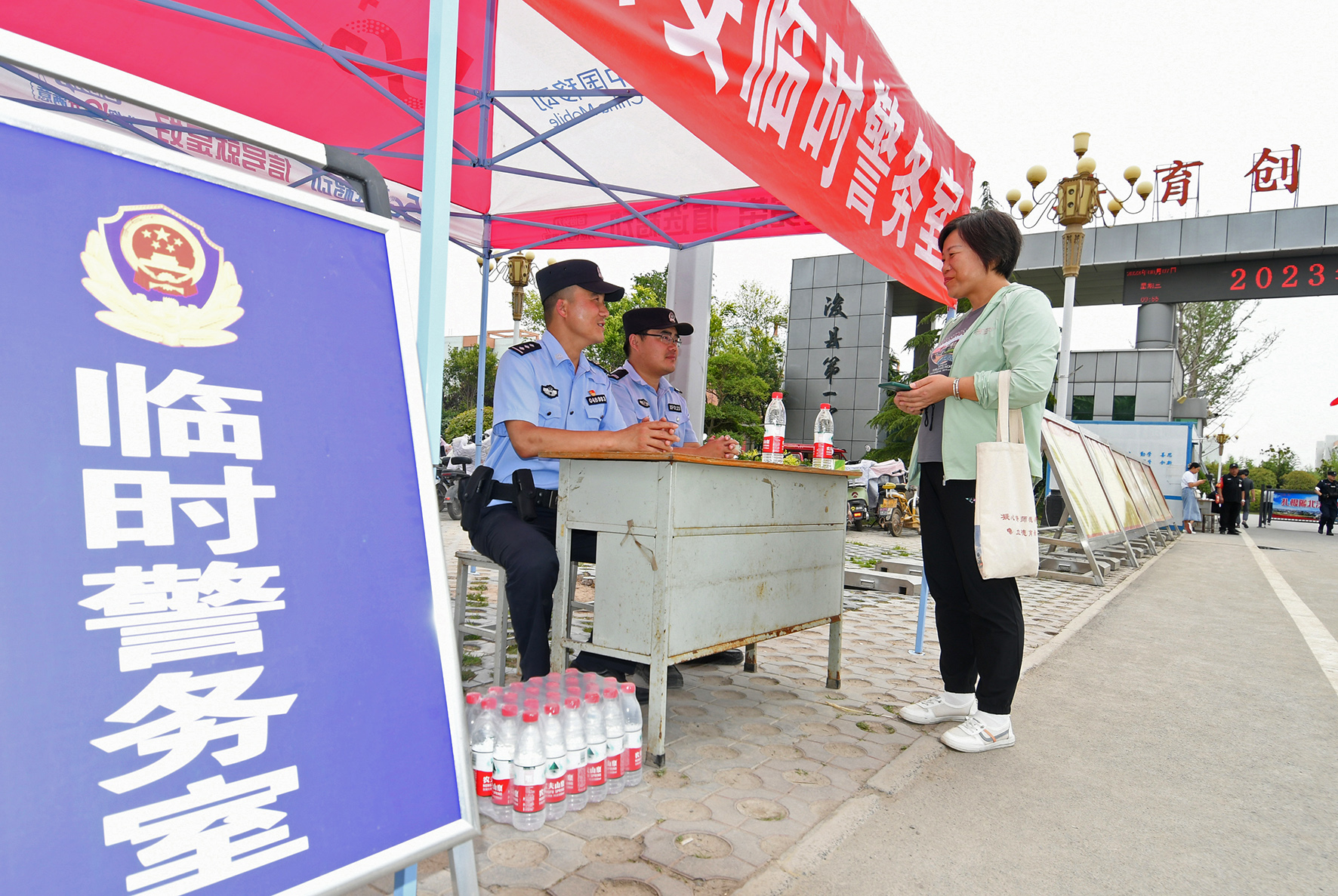 6月7日,河南省浚縣公安局在高考考點設(shè)立“愛心護考”執(zhí)勤點,為考生及家長提供溫馨服務(wù)。