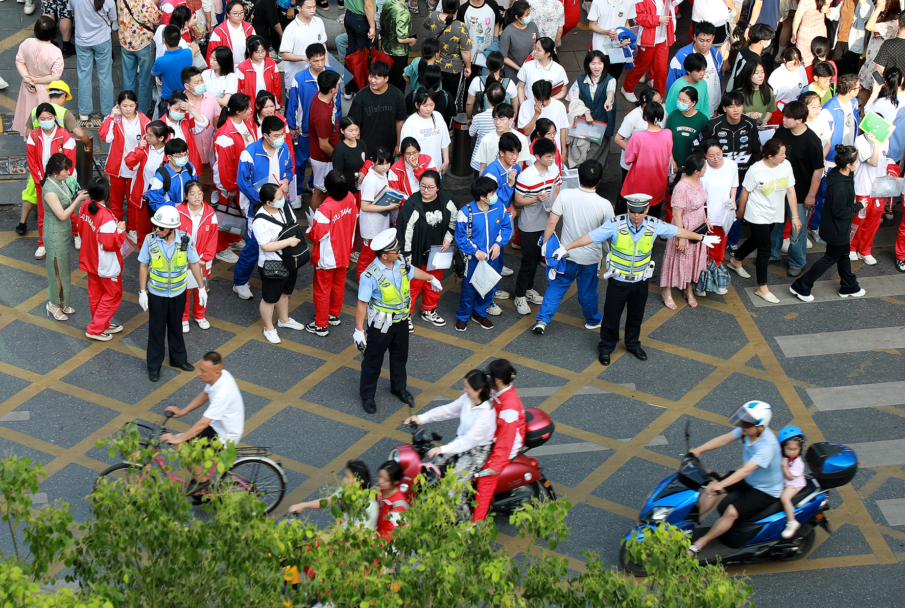 6月8日,安徽省巢湖市公安局交警大隊民輔警在維護高考考生散場后的路面交通秩序。
