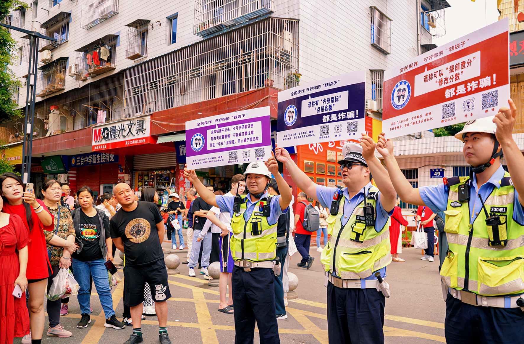 6月7日,四川省綿陽市公安局針對提前查分、修改分數(shù)等詐騙行為,在多個考場外設(shè)置宣傳點,組織民警向等候的家長開展防詐宣傳。
