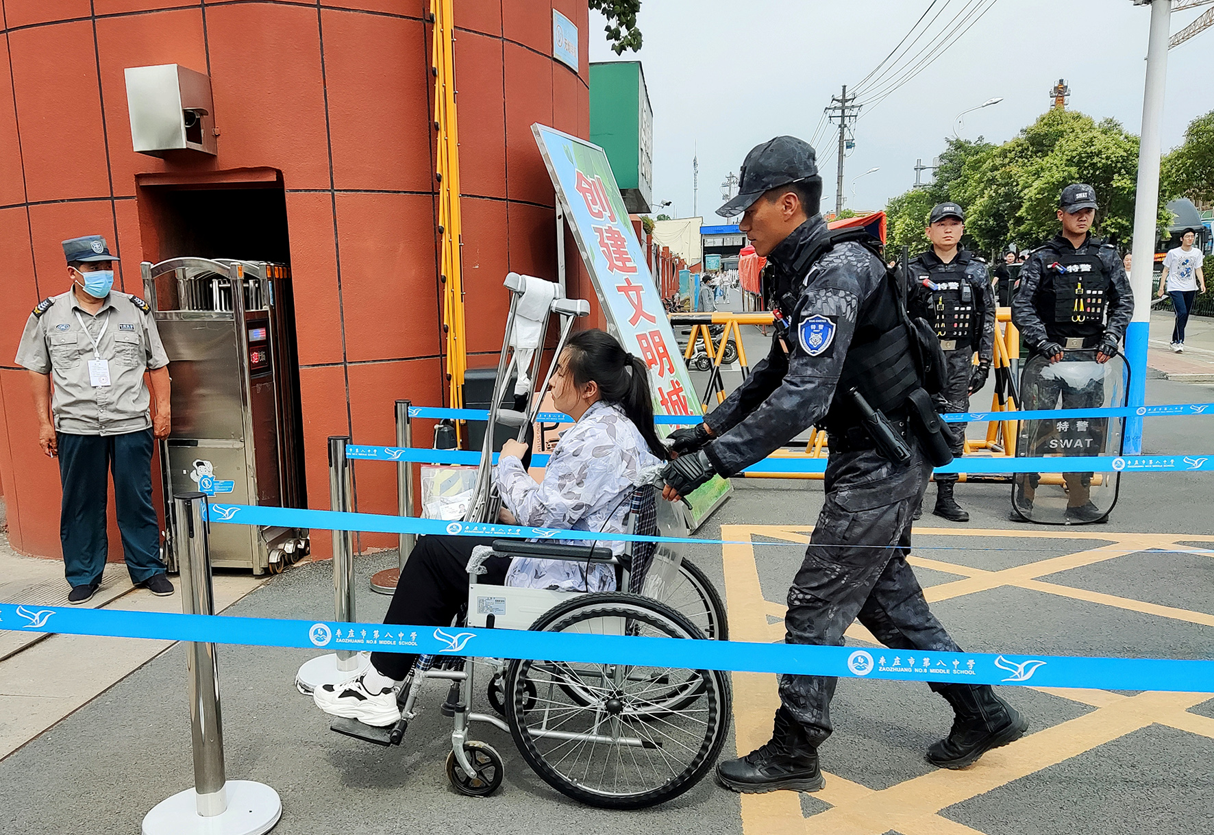 6月7日,山東省棗莊市公安局薛城分局民警在轄區(qū)棗莊第八中學考點幫助行動不便的考生進入考場。