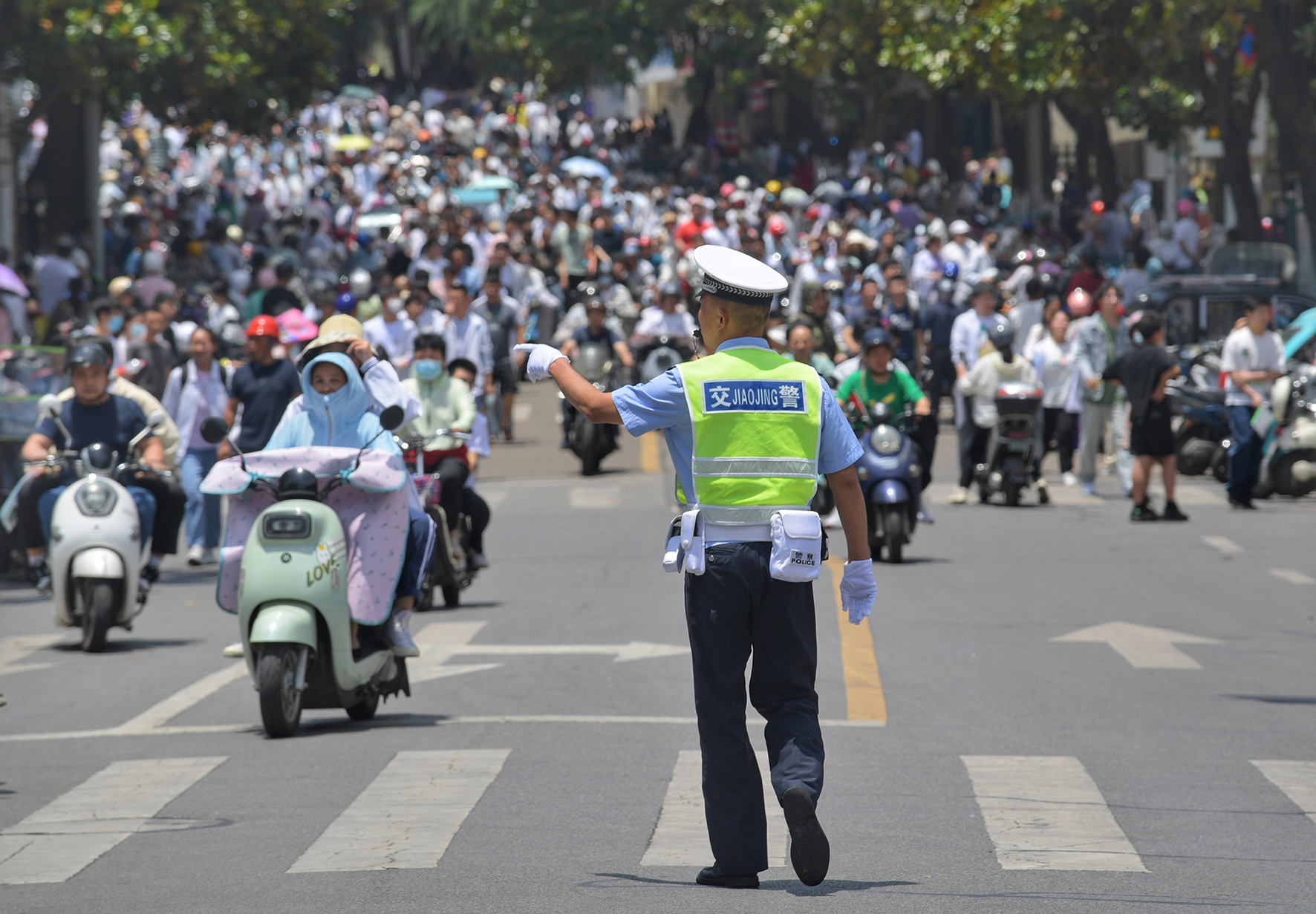 6月7日,江西省九江市公安局交管支隊第一大隊民警加強對考點周邊道路的指揮疏導(dǎo)和停車管理,為考生創(chuàng)造安全有序的考試環(huán)境。