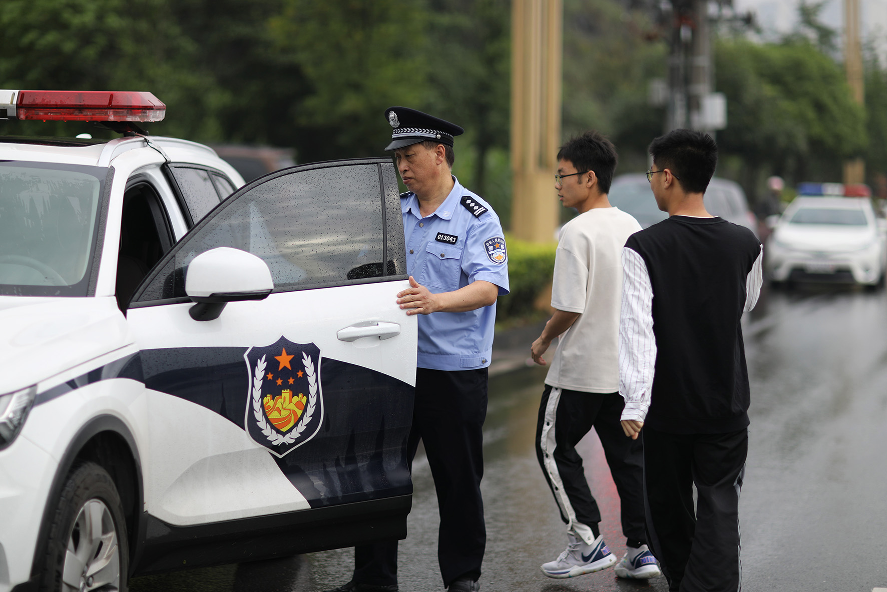 6月8日,貴州省赤水市公安局執(zhí)勤民警在第三中學考點準備駕車幫助一位考生去取忘帶的準考證。