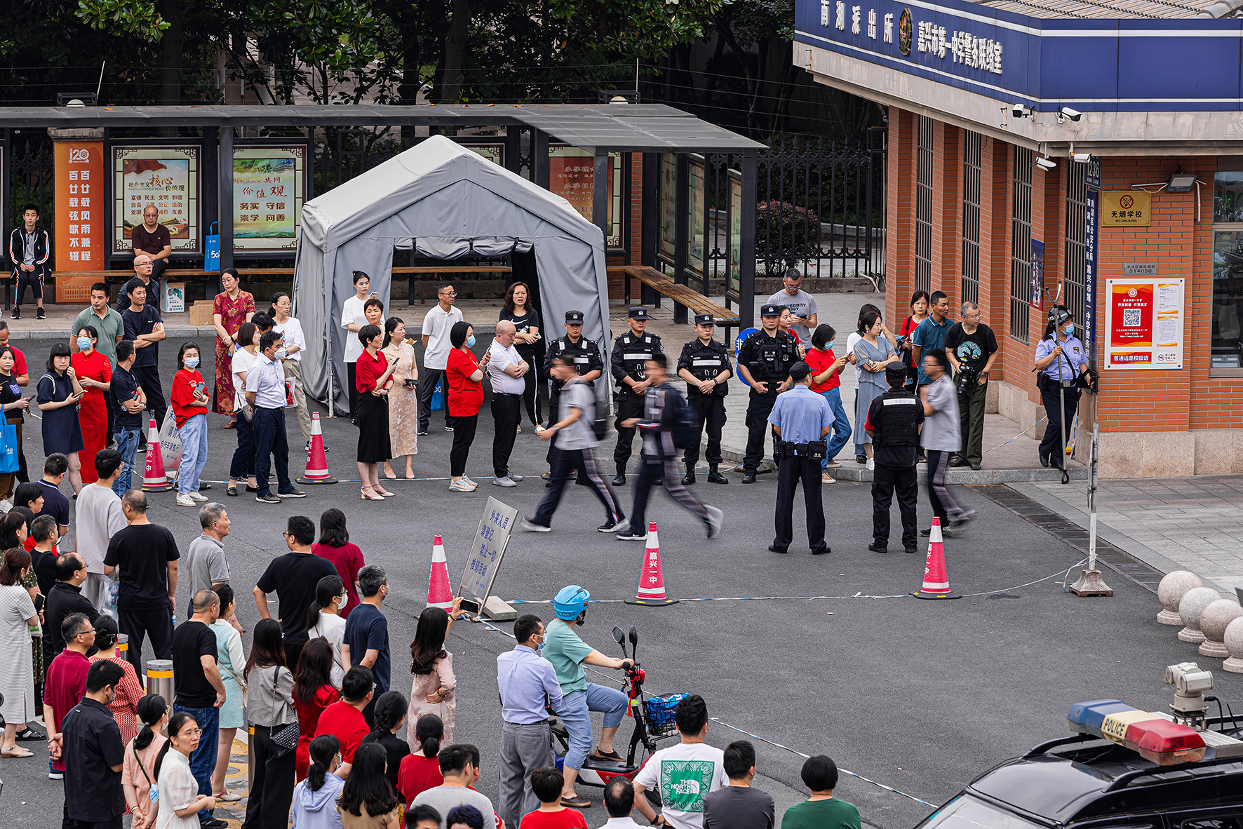 6月7日,浙江省嘉興市公安局南湖區(qū)分局民警在考點通過定點值守和武裝巡邏,確保廣大考生安全順利參加高考。