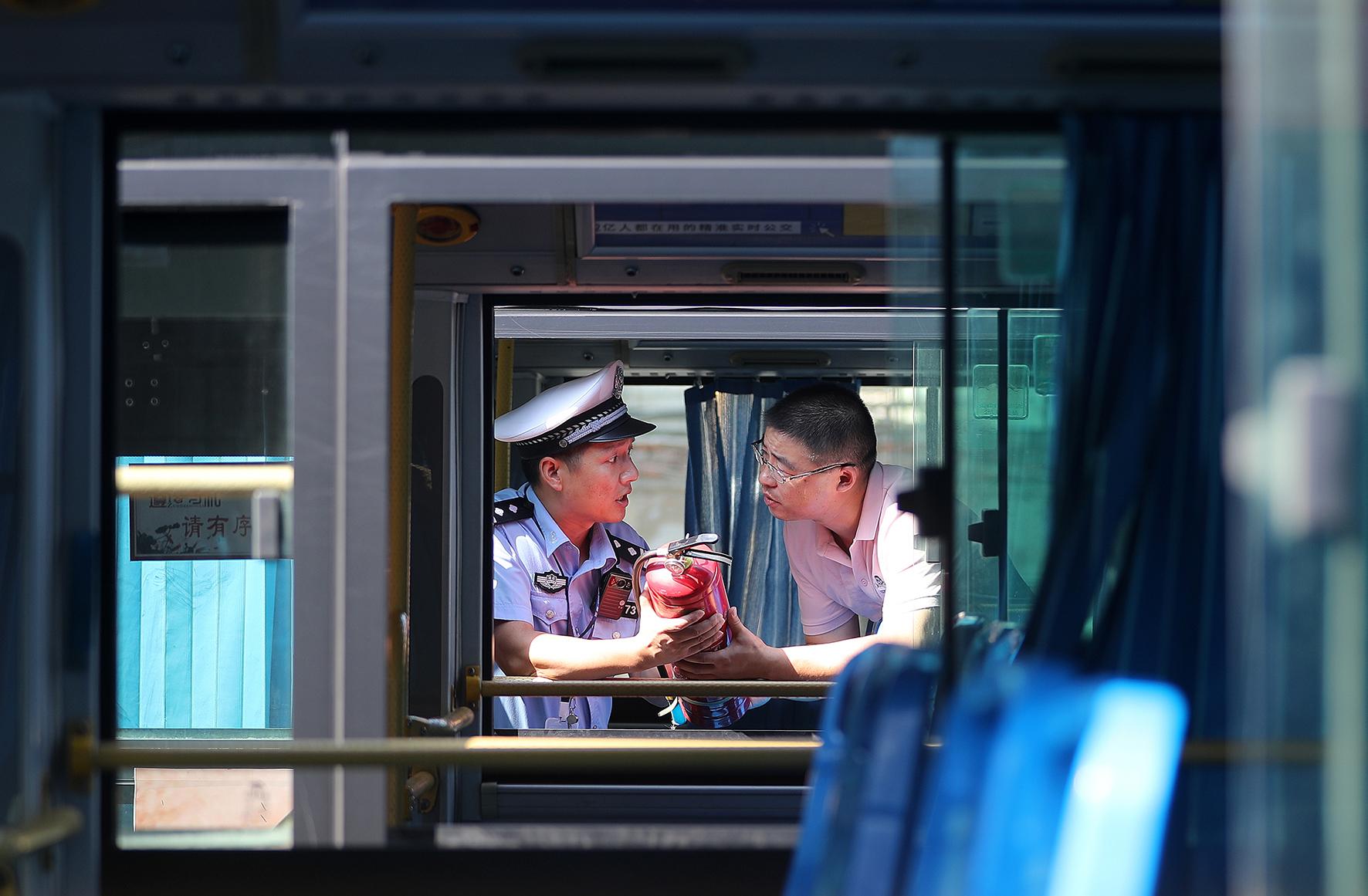 7月17日,湖北省荊門市公安局交警支隊民警仔細(xì)檢查公交車制動系統(tǒng)、逃生錘、安全帶、滅火器等安全設(shè)備。連日來,湖北天氣持續(xù)高溫,荊門市公安局交警支隊組織民警,對運(yùn)行的公交車開展全面“體檢”,杜絕車輛“帶病”上路,確保群眾安全出行。