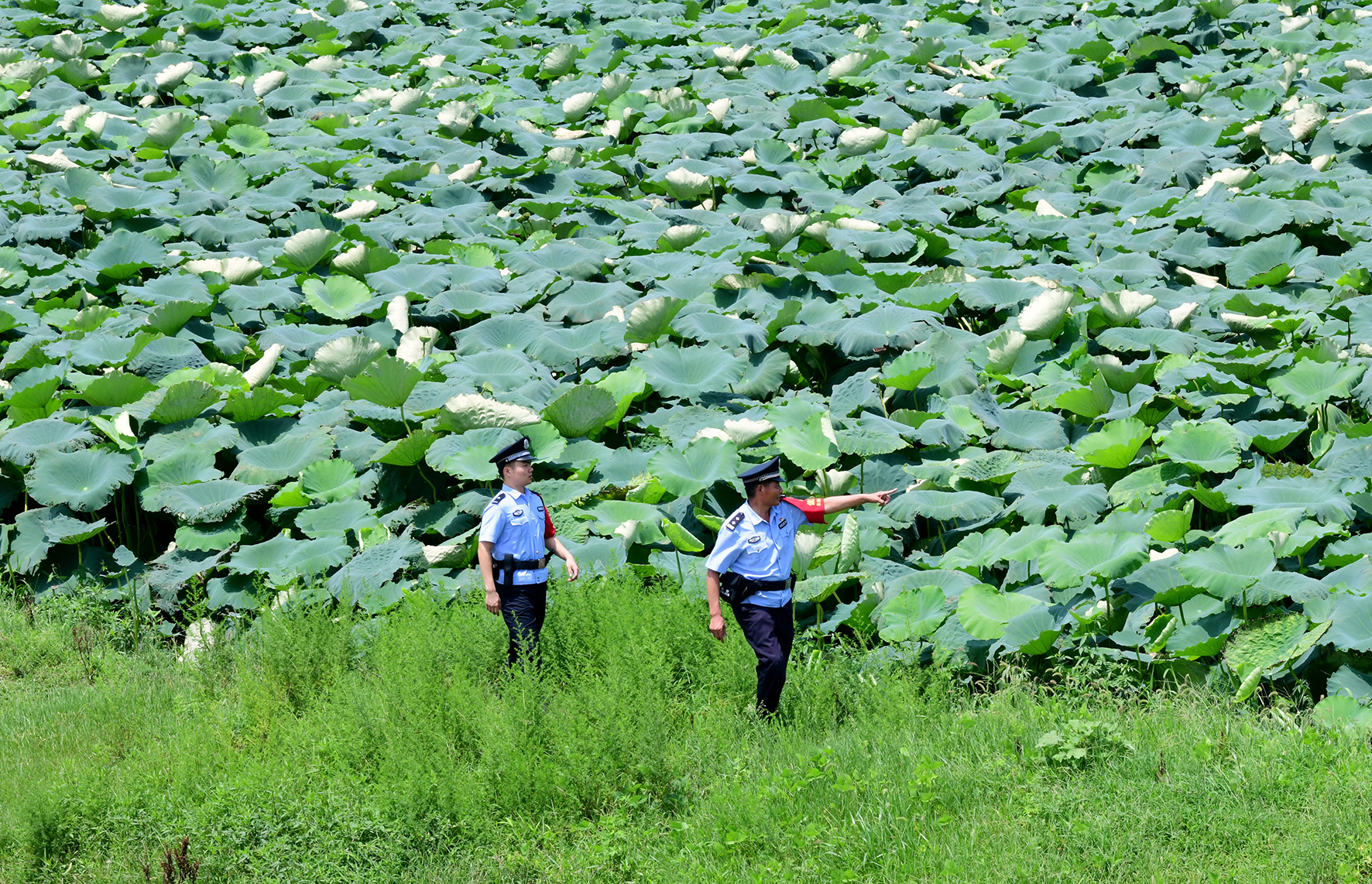 8月2日,安徽省阜南縣公安局安崗派出所民警在曹集鎮(zhèn)萬畝藕蓮基地巡查。曹集鎮(zhèn)位于淮河岸邊,當(dāng)?shù)卮迕窭脻竦厮练N植藕蓮發(fā)展特色經(jīng)濟(jì),阜南縣公安局安崗派出所組織警力加強(qiáng)萬畝藕蓮基地白天夜晚的巡查力度,護(hù)航鄉(xiāng)村振興經(jīng)濟(jì)發(fā)展。