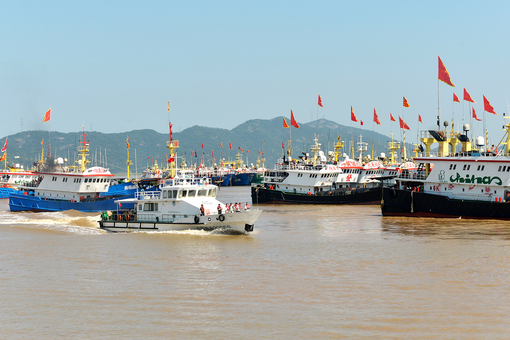 8月6日,浙江省臺州市三門縣公安局海防大隊(duì)民警和漁政、海事執(zhí)法人員駕駛執(zhí)法船在健跳漁港巡邏,為開漁保駕護(hù)航。
