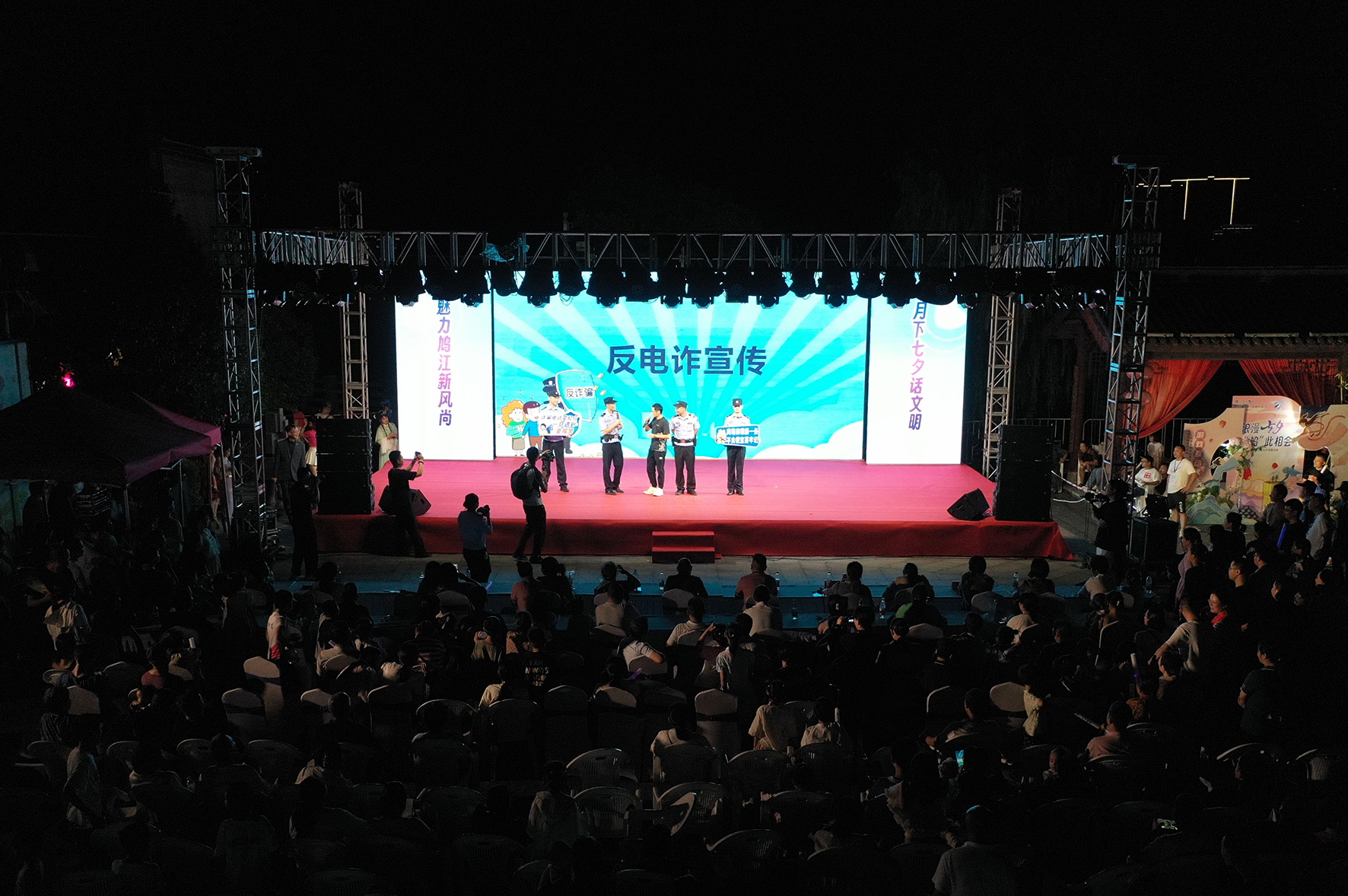 8月18日,安徽省蕪湖市公安局鳩江分局清水派出所民警在鳩茲古鎮(zhèn)迎“七夕”歌會演出現(xiàn)場,向觀眾宣傳“反詐”等安全知識。