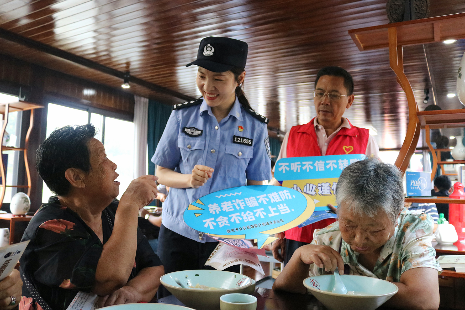 8月21日清晨,江蘇省泰州市公安局海陵分局城北派出所組織反詐宣傳員來到海陵早茶店,向市民送上“反詐早茶”,提高市民的識詐反詐能力,讓反詐宣傳入腦入心。