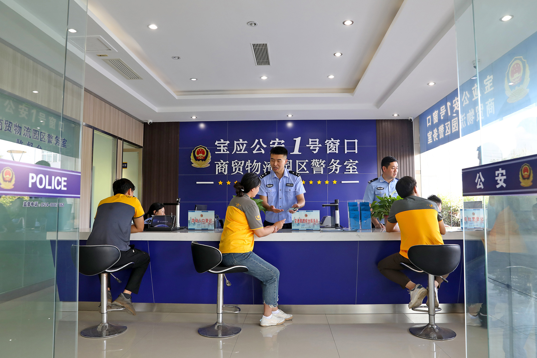 8月21日,江蘇省寶應(yīng)縣公安局涇河鎮(zhèn)商貿(mào)物流園區(qū)警企服務(wù)站民警正在給企業(yè)員工辦理戶政業(yè)務(wù)。近日,寶應(yīng)縣公安局在涇河鎮(zhèn)商貿(mào)物流園區(qū)開(kāi)設(shè)了警企服務(wù)站、調(diào)解室等服務(wù)平臺(tái),解決了轄區(qū)40多家物流企業(yè)和員工辦證難等問(wèn)題,讓企業(yè)員工不出園區(qū)即可辦理諸多政務(wù)服務(wù),打通了為企業(yè)服務(wù)的“最后一公里”。
