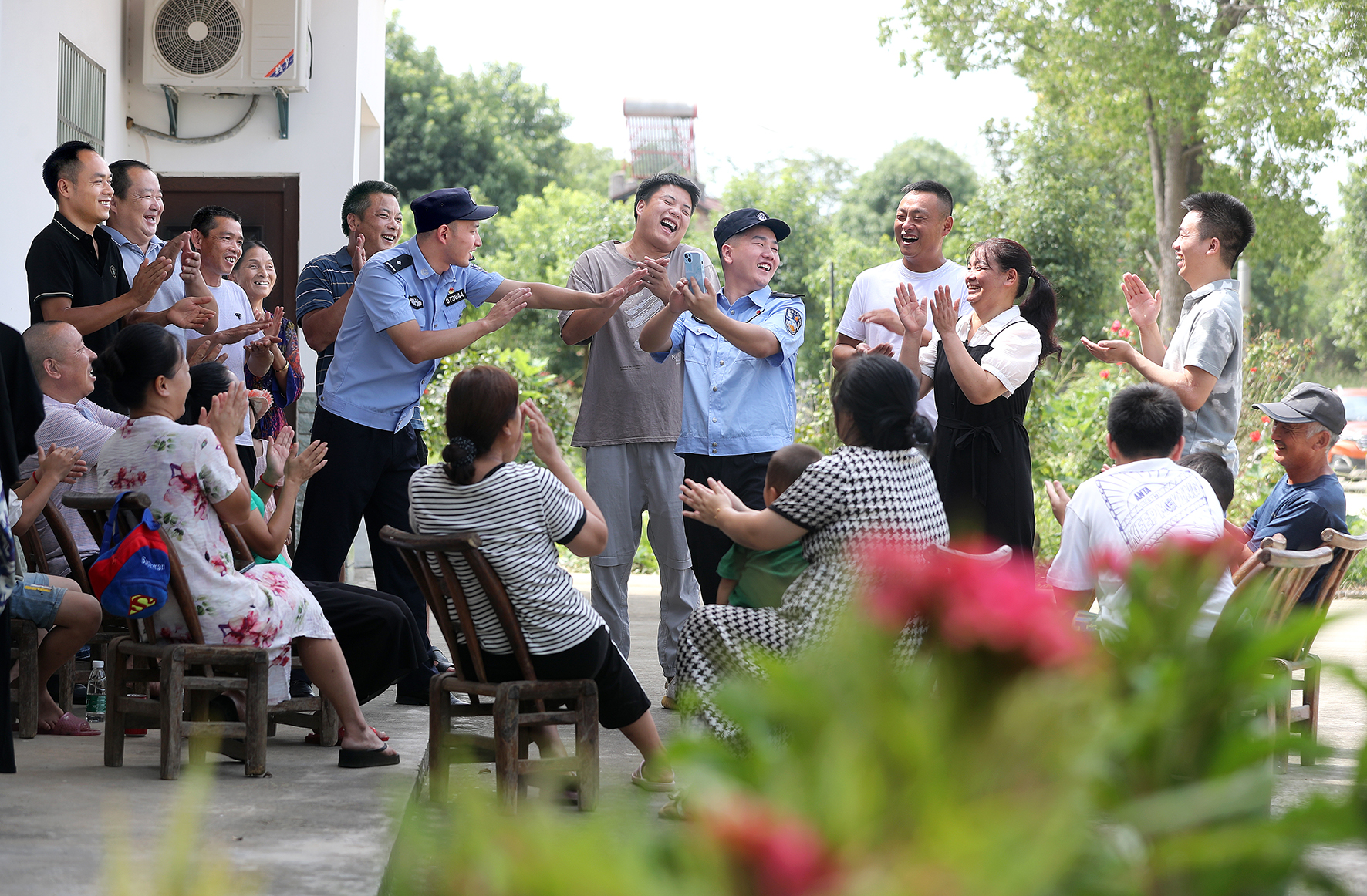 8月24日,在湖北省沙洋縣紀(jì)山鎮(zhèn)紀(jì)山村,沙洋縣公安局紀(jì)山派出所民警演繹幽默的“反詐相聲”,逗得村民笑開了懷。