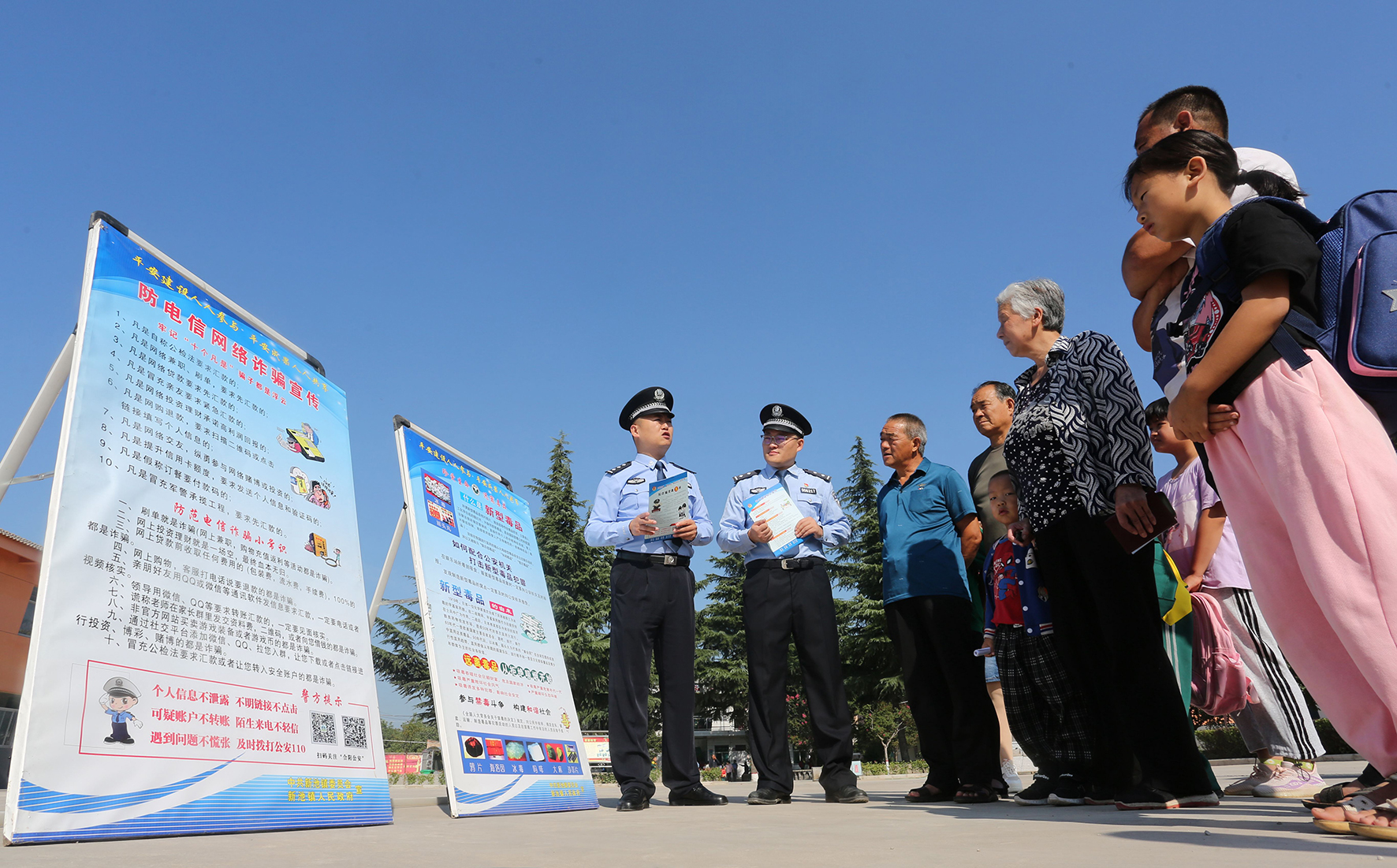 8月31日,陜西省渭南市合陽(yáng)縣新池鎮(zhèn)中心小學(xué),民警向?qū)W生和家長(zhǎng)講解電信詐騙的危害。