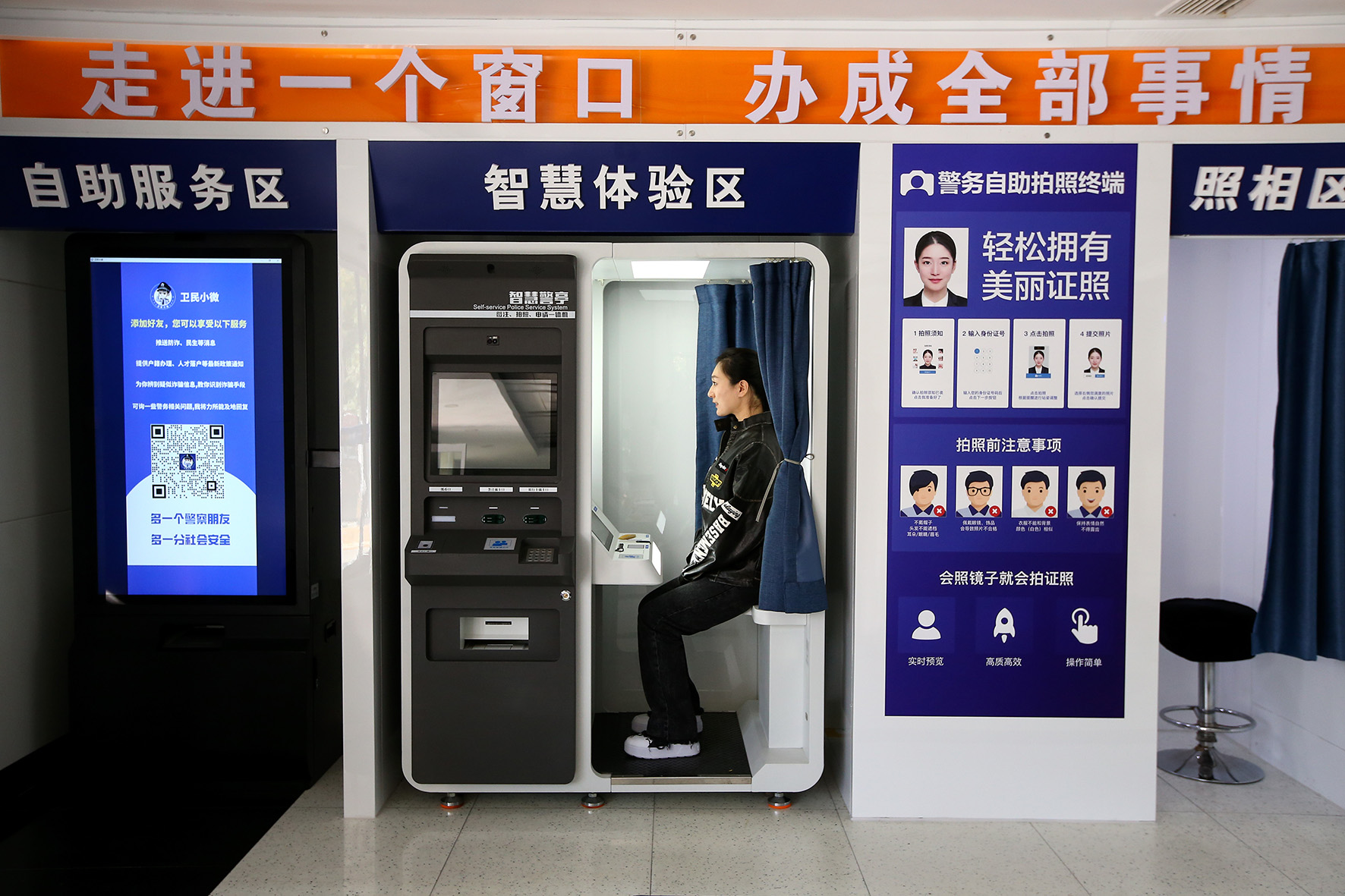 圖為10月25日,群眾在四里村派出所“一窗通辦”服務(wù)大廳,通過(guò)自助設(shè)備拍照采集個(gè)人信息,辦理相關(guān)業(yè)務(wù)。