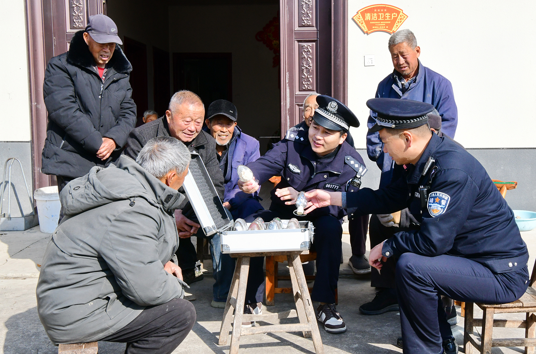 11月24日,安徽省阜南縣鹿城鎮(zhèn)劉樓村片區(qū)民警李明在村民家中講解如何識別毒品。