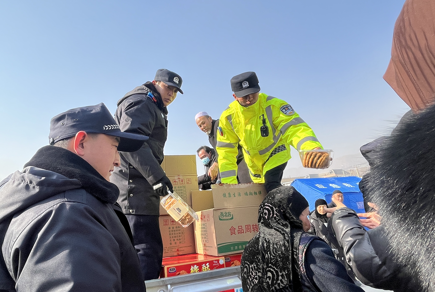 12月20日,甘肅省永靖縣公安局民輔警在積石山縣大河家臨時(shí)安置點(diǎn),按照抗震救災(zāi)指令要求,開(kāi)展社會(huì)面管控、秩序維護(hù)、分發(fā)物資、搭建帳篷等工作,全力投入抗震救災(zāi)第一線。