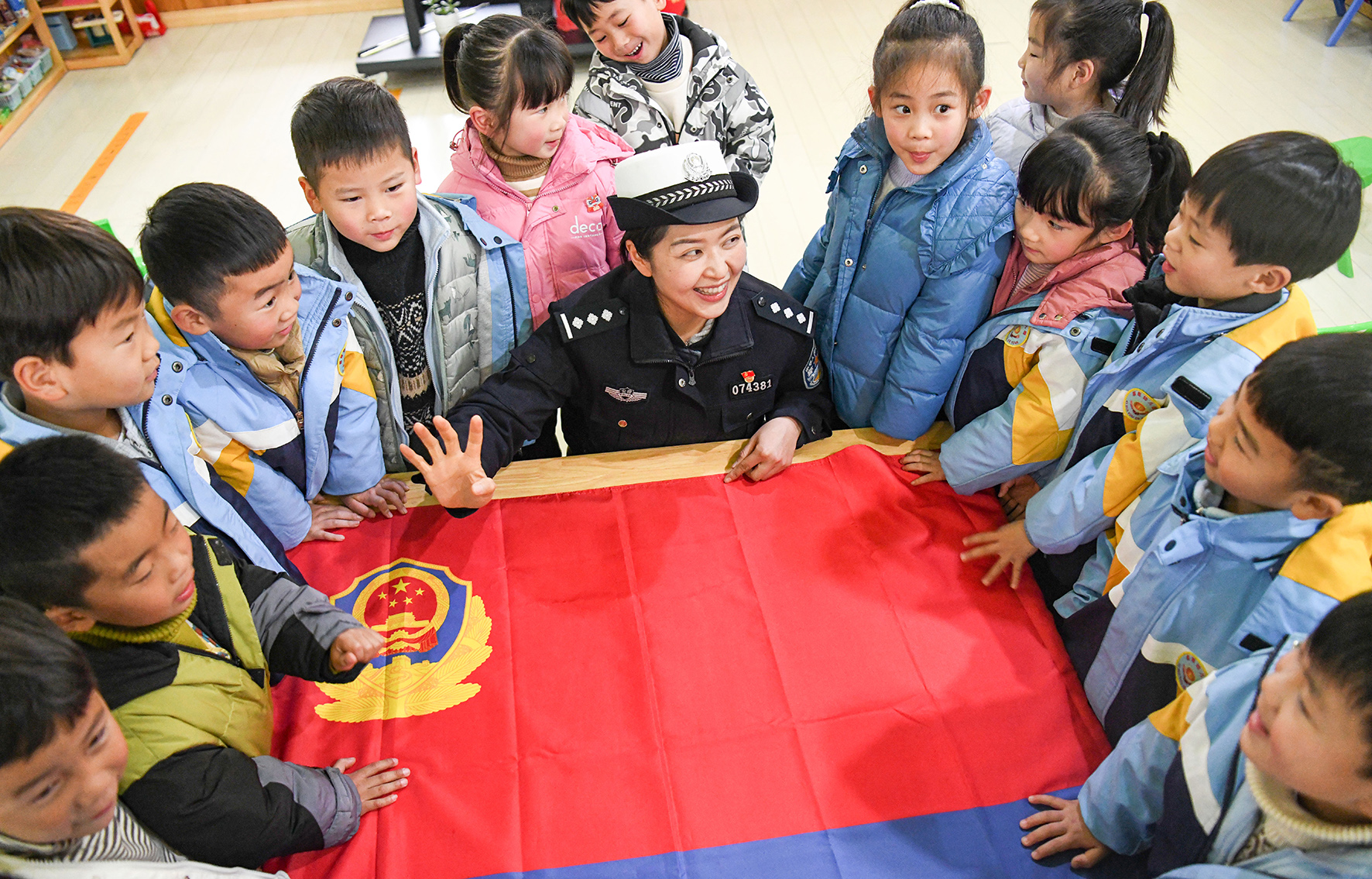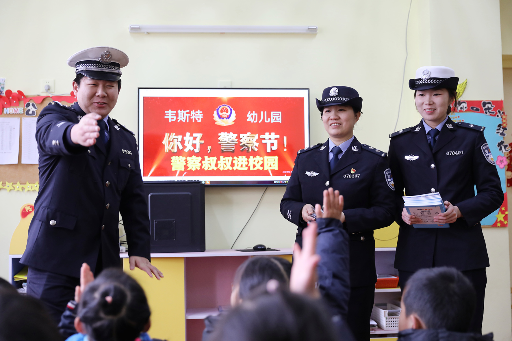 1月9日,安徽省蕪湖市公安局鳩江分局、交警大隊民警走進鳩江區(qū)韋斯特幼兒園,給小朋友們講解110、警旗等相關知識。