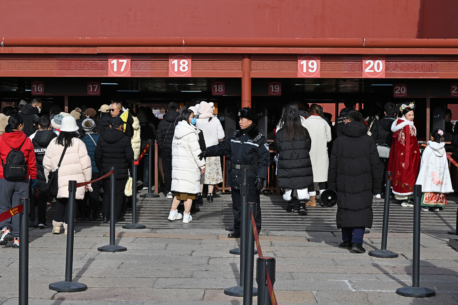 民警在進入午門的安檢通道前維持秩序。