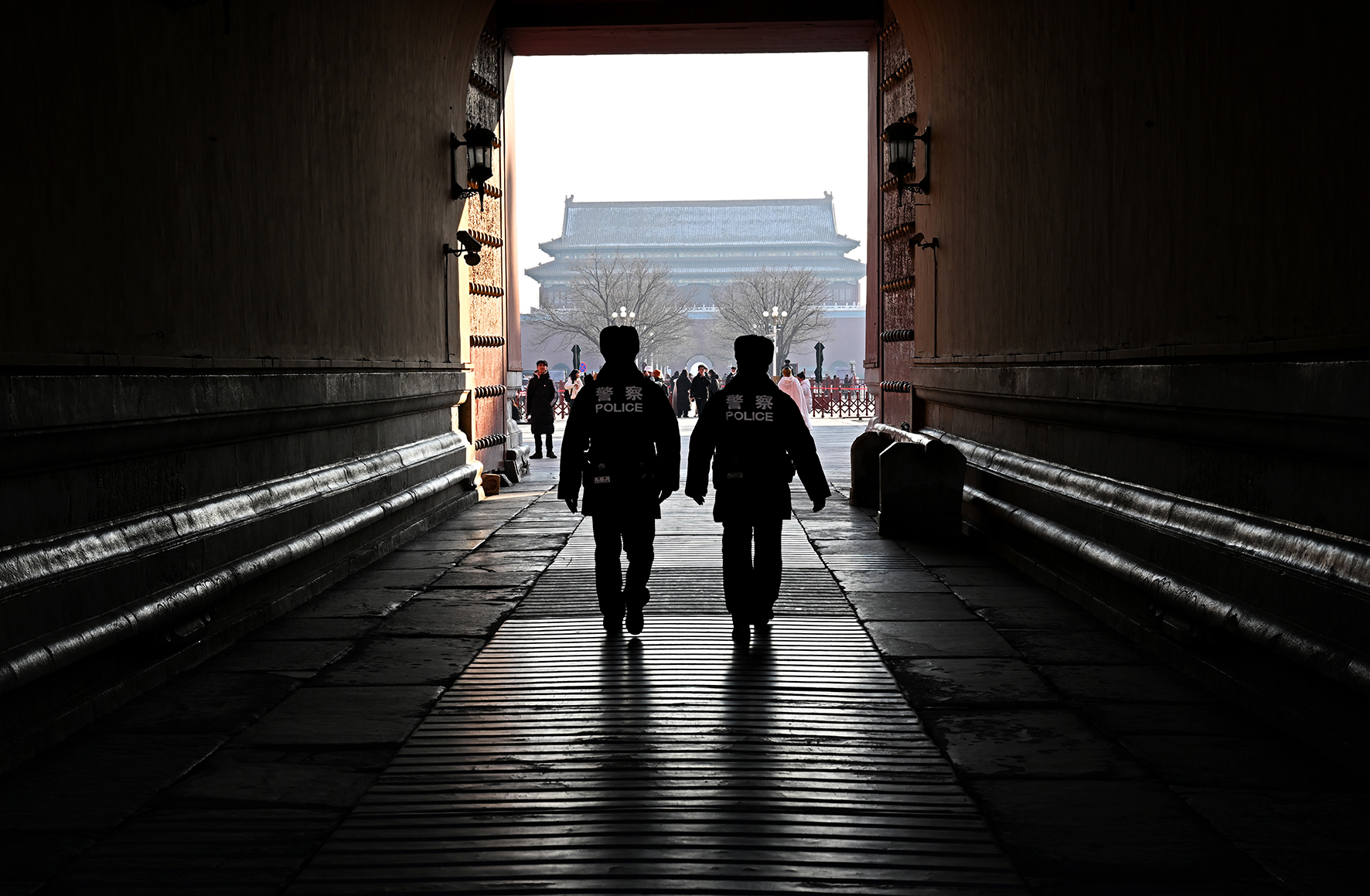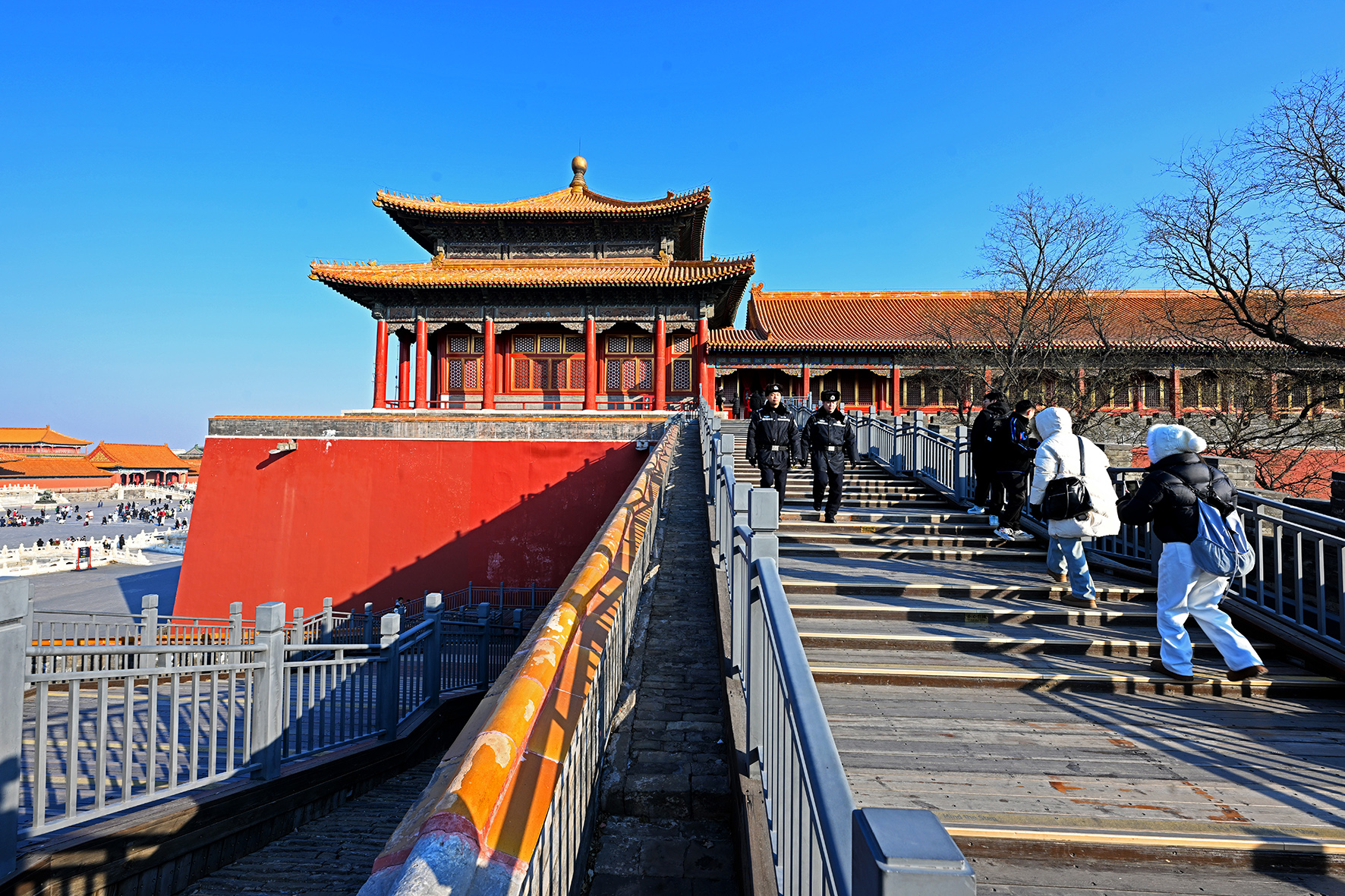 民警在午門西雁翅樓進行巡查。午門東西雁翅樓是舉辦各種文化展覽活動的場所。