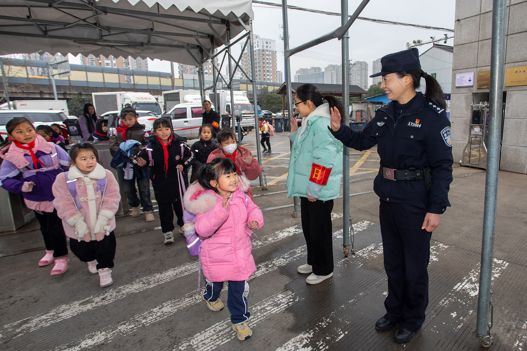 2月26日,安徽省蕪湖市弋江大隊(duì)女子護(hù)學(xué)崗民警在安師大附屬小學(xué)(西校區(qū))護(hù)送上學(xué)孩子過(guò)馬路,確保學(xué)生上放學(xué)安全。