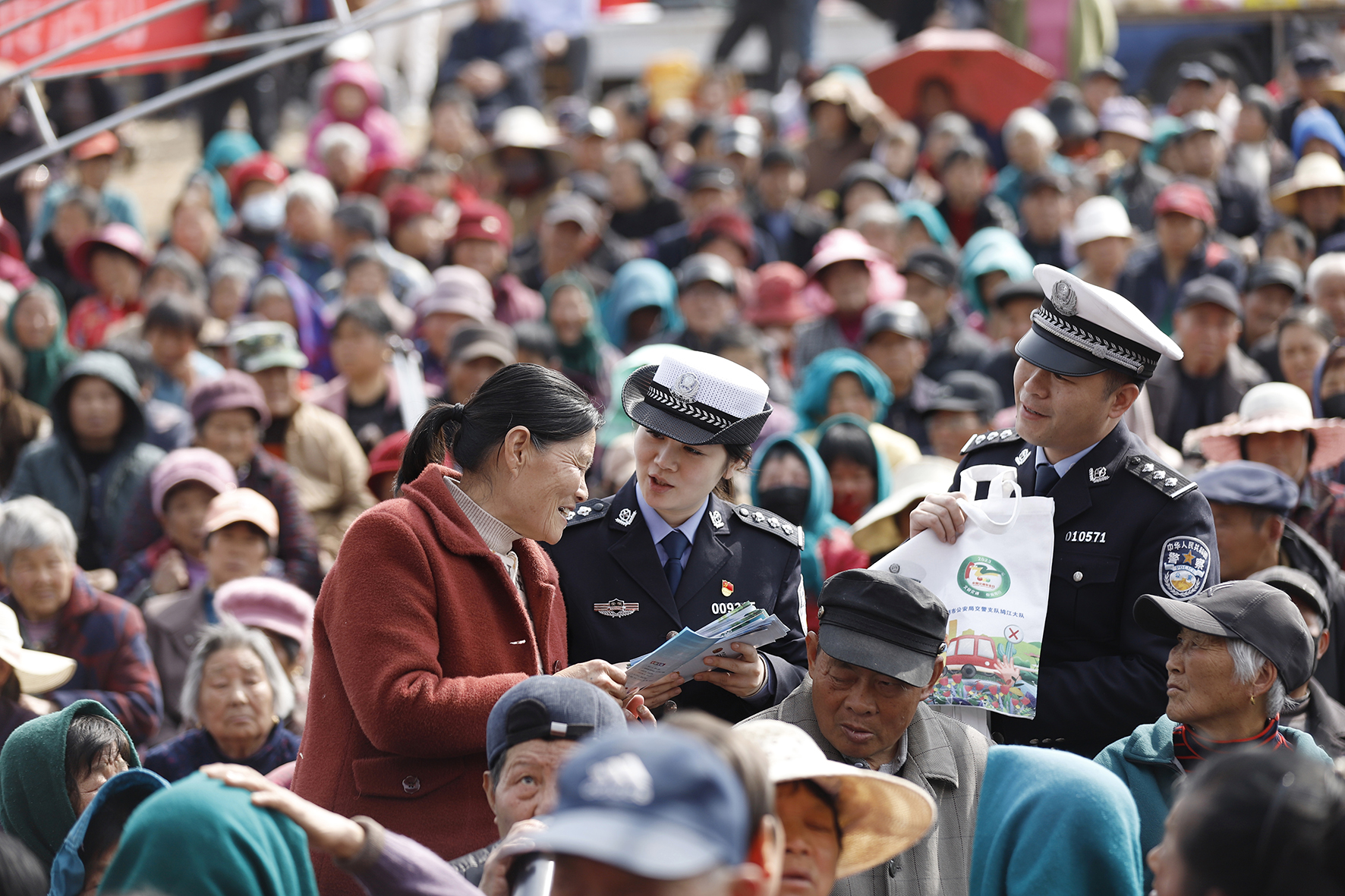 3月8日,安徽省蕪湖市公安局交警支隊鳩江大隊民警在湯溝鎮(zhèn)前進村廬劇演出現場,向群眾講解“一盔一帶”等交通安全知識。