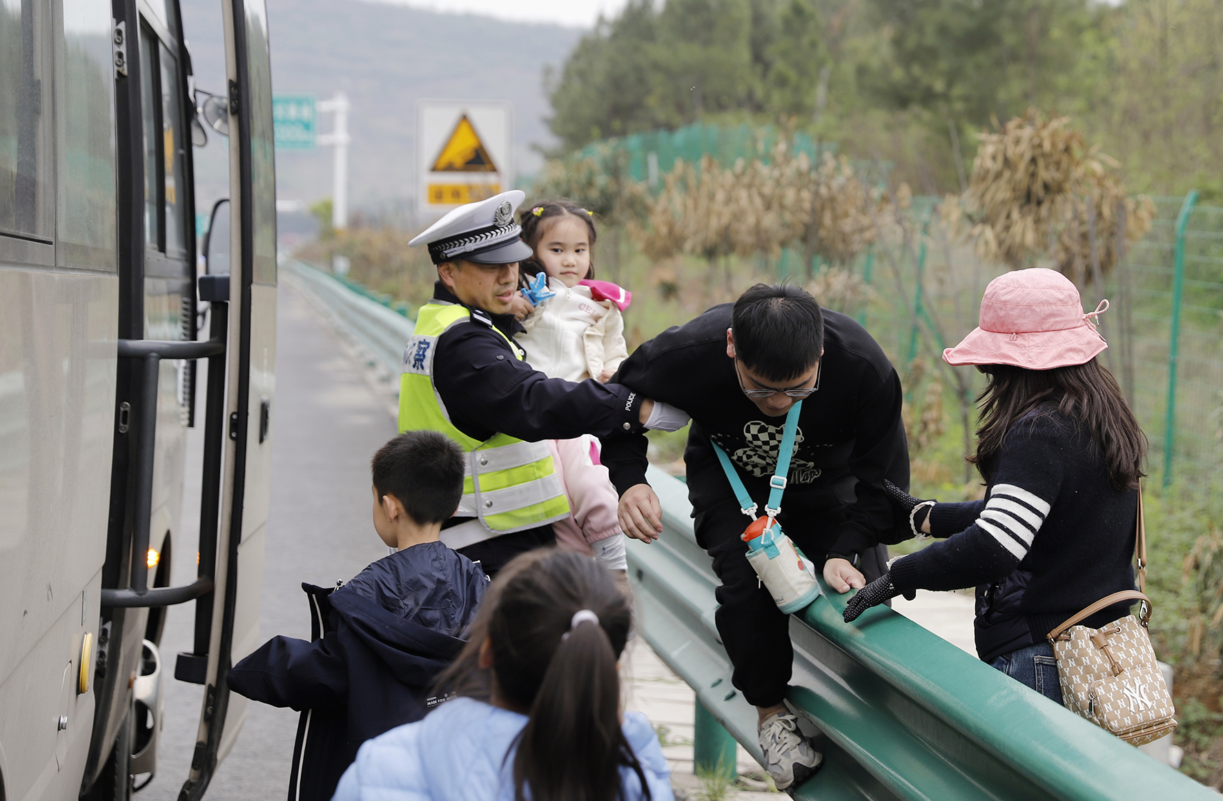4月4日,安徽省蕪湖市公安局交警支隊(duì)高速三大隊(duì)民警在合蕪高速福山服務(wù)區(qū)附近路段,協(xié)助轉(zhuǎn)運(yùn)故障車乘客。