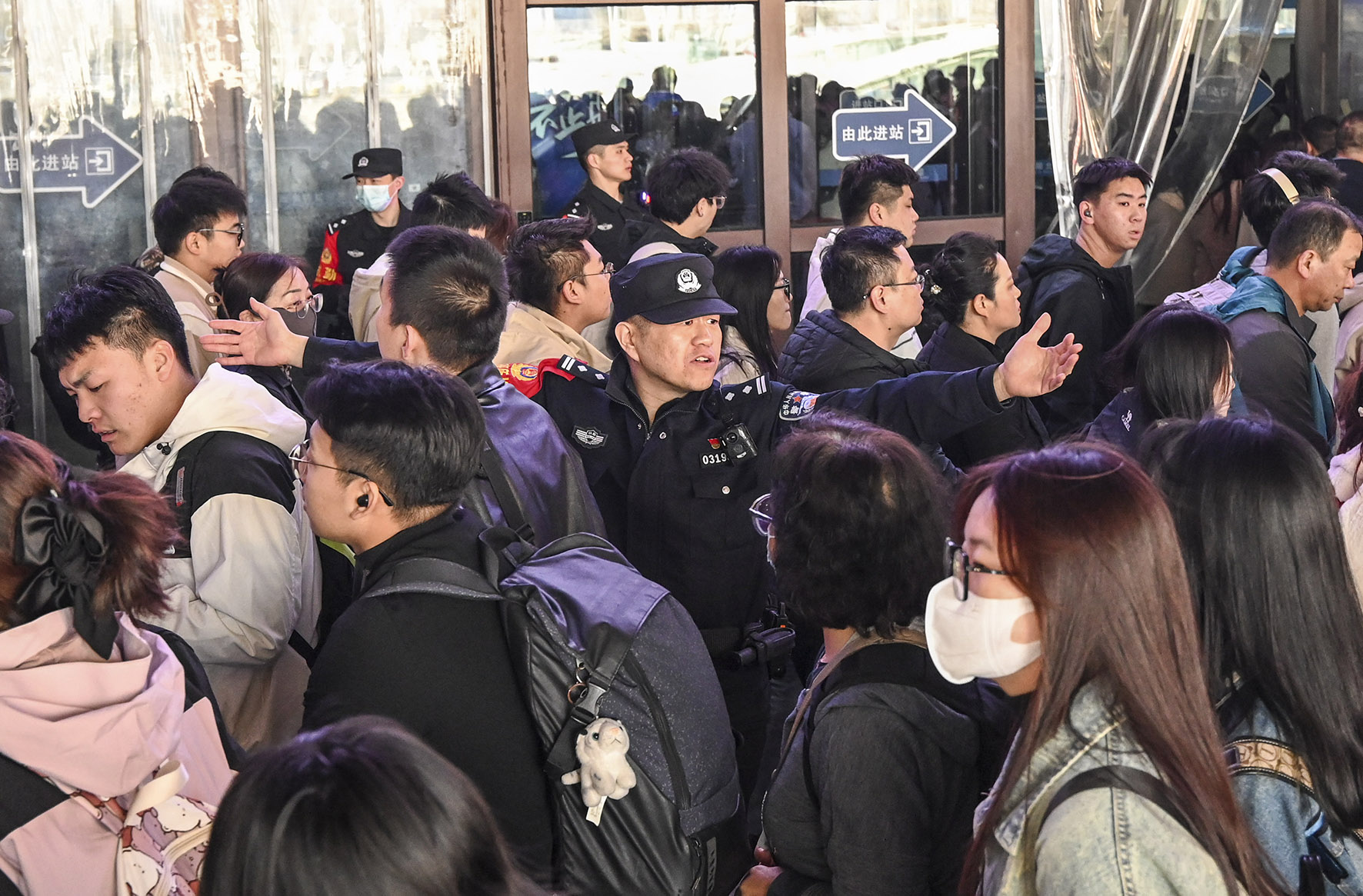 圖為4月4日,沈陽鐵路公安局沈陽公安處民警在沈陽北站全力維護(hù)進(jìn)站秩序。
