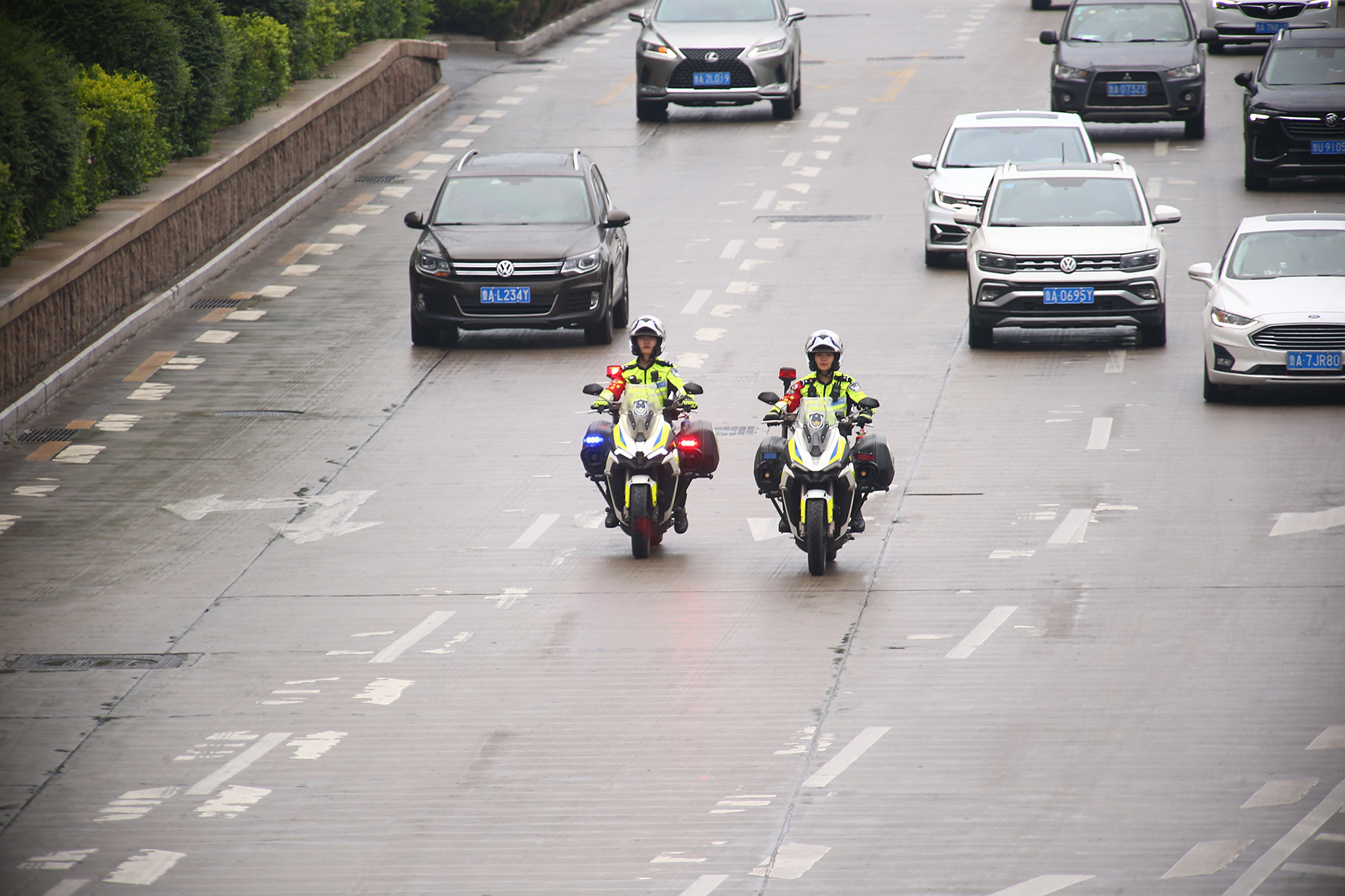 5月1日,山西省運(yùn)城市新絳縣公安局交警大隊(duì)古城中隊(duì)民輔警在汾河公路大橋巡查。