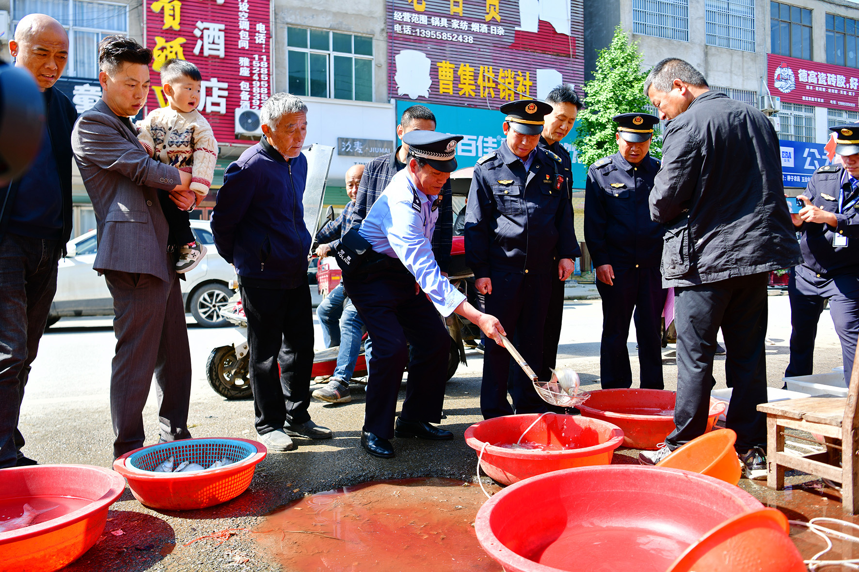 5月1日,安徽省阜南縣公安局安崗派出所民警聯(lián)合農(nóng)業(yè)執(zhí)法人員在位于淮河岸邊的曹集鎮(zhèn)農(nóng)貿(mào)市場(chǎng)開(kāi)展檢查。
