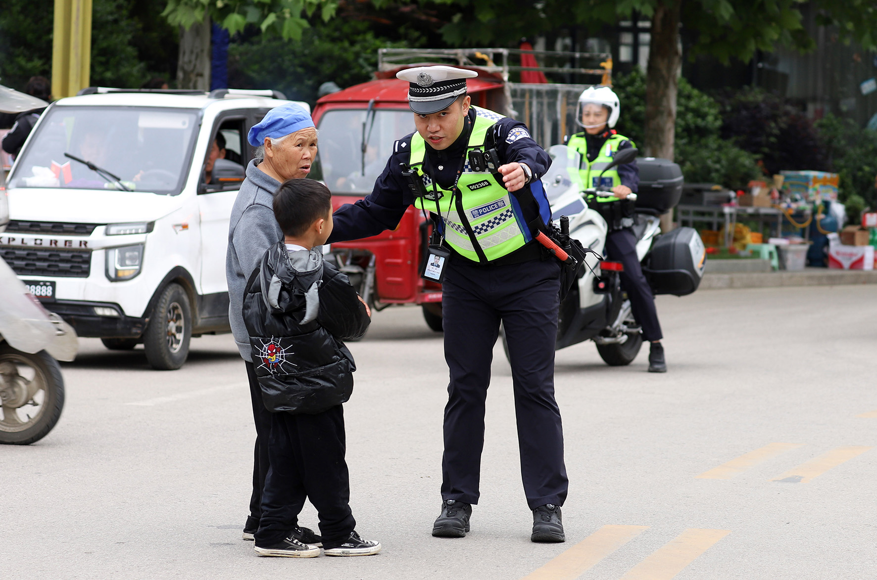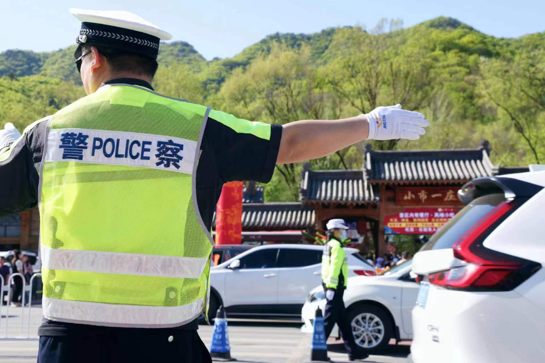5月2日,遼寧省本溪滿族自治縣公安局交通管理大隊(duì)民輔警在景區(qū)道路上執(zhí)勤,疏導(dǎo)行人和車輛。