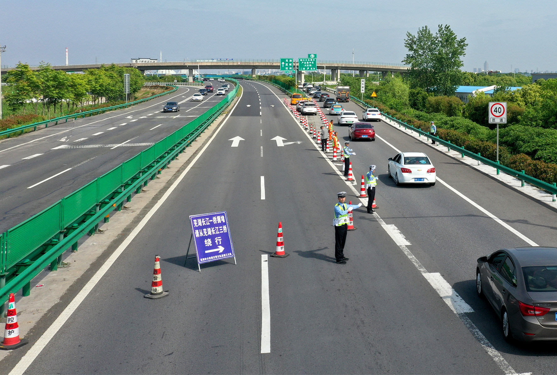 5月1日,安徽省蕪湖市公安局交警支隊(duì)三大隊(duì)民警在合蕪高速公路蕪湖段二壩樞紐對(duì)擁堵車流進(jìn)行分流,確保蕪湖長(zhǎng)江大橋車輛通行暢通有序。