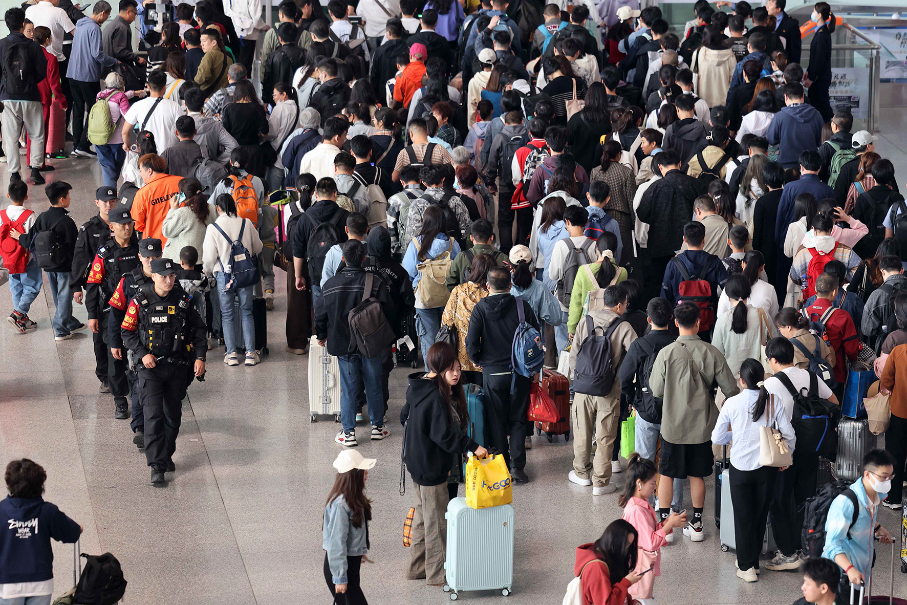 5月1日,在滬昆高鐵貴州銅仁南站,成都鐵路公安局貴陽(yáng)公安處銅仁南車站派出所民警在引導(dǎo)旅客乘車。
