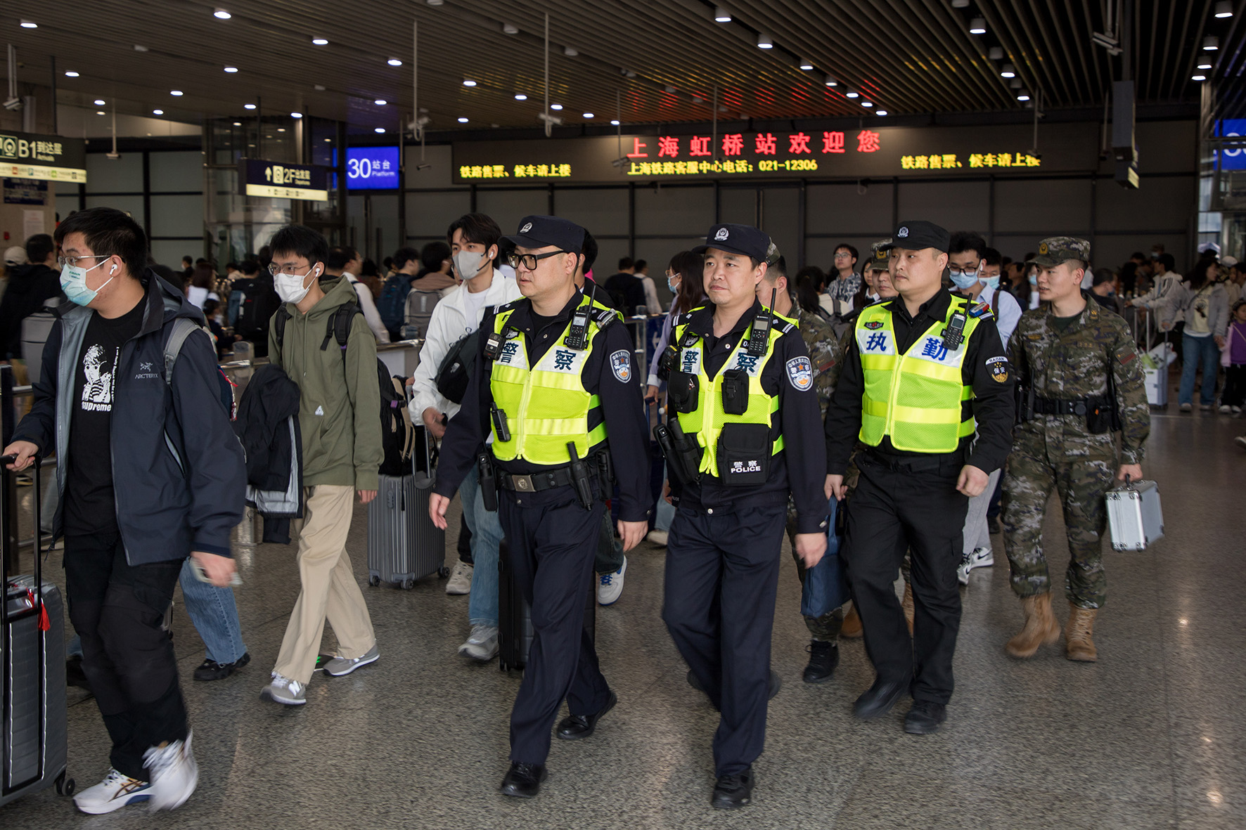 5月4日,針對(duì)虹橋火車站超60萬(wàn)人次的到發(fā)旅客人數(shù),上海市公安局閔行分局增派警力開(kāi)展步巡,提升應(yīng)急處突和服務(wù)群眾的能力。