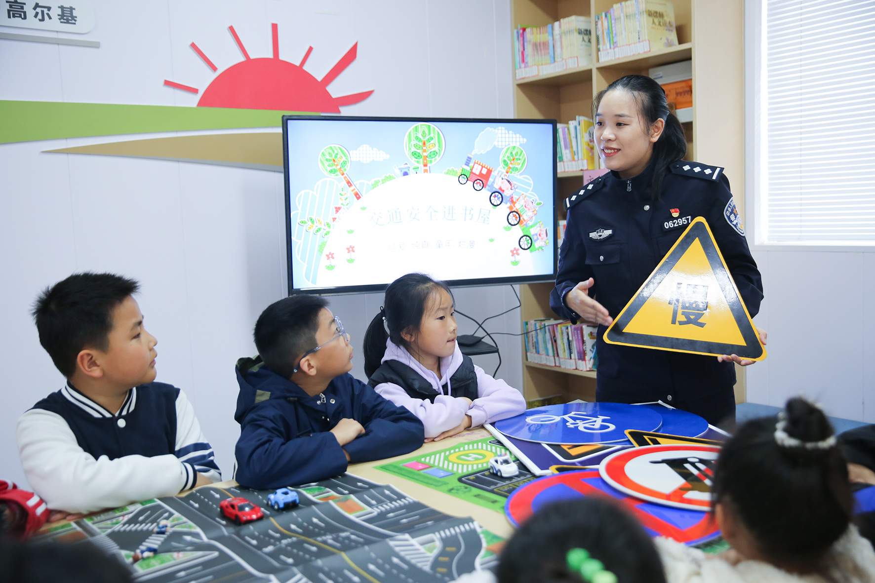 5月5日,江蘇省如皋市城南街道馬塘社區(qū)農(nóng)家書屋假期交通安全課堂上,高新區(qū)交警中隊(duì)民警向?qū)W生交通安全知識(shí)普及。