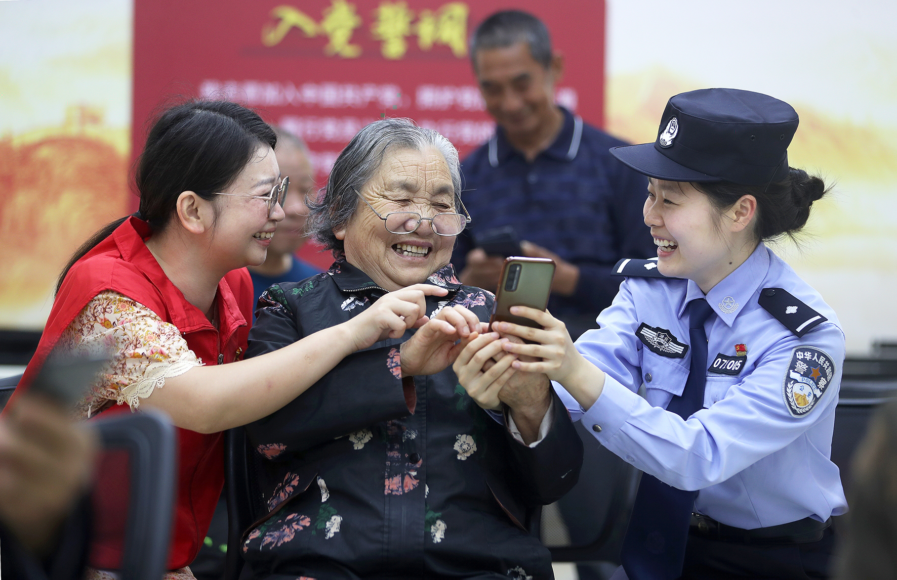 5月7日,湖北省荊門市公安局東寶分局泉口派出所民警和社區(qū)工作人員在蘇畈橋社區(qū),手把手幫助老年人使用國(guó)家反詐中心App軟件。
