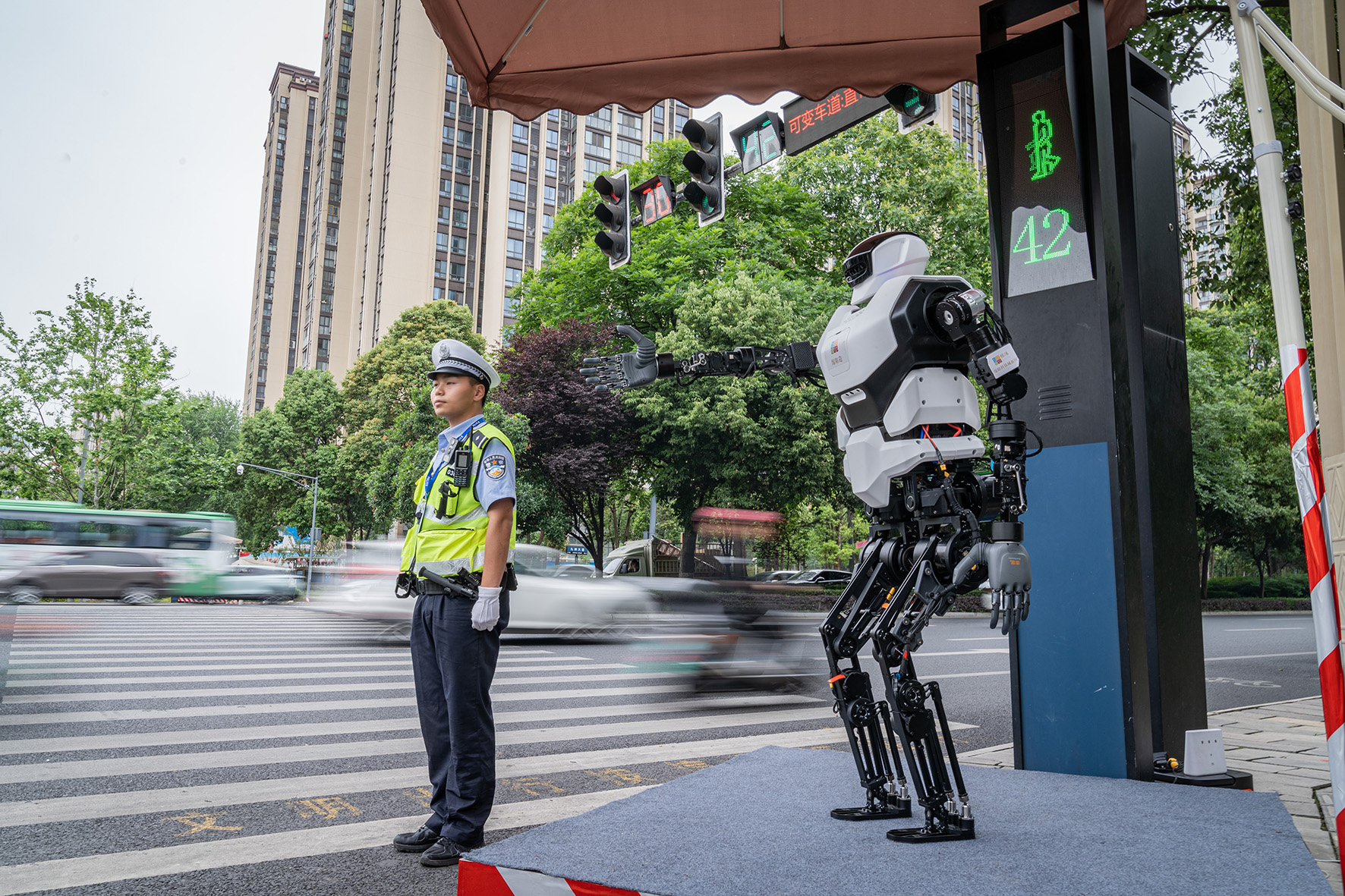 圖為5月11日,“綿陽造”人形機器人在四川省綿陽市科技城新區(qū)九洲大道與園藝街交叉路口,作為文明交通勸導(dǎo)“志愿者”配合民警開展工作。